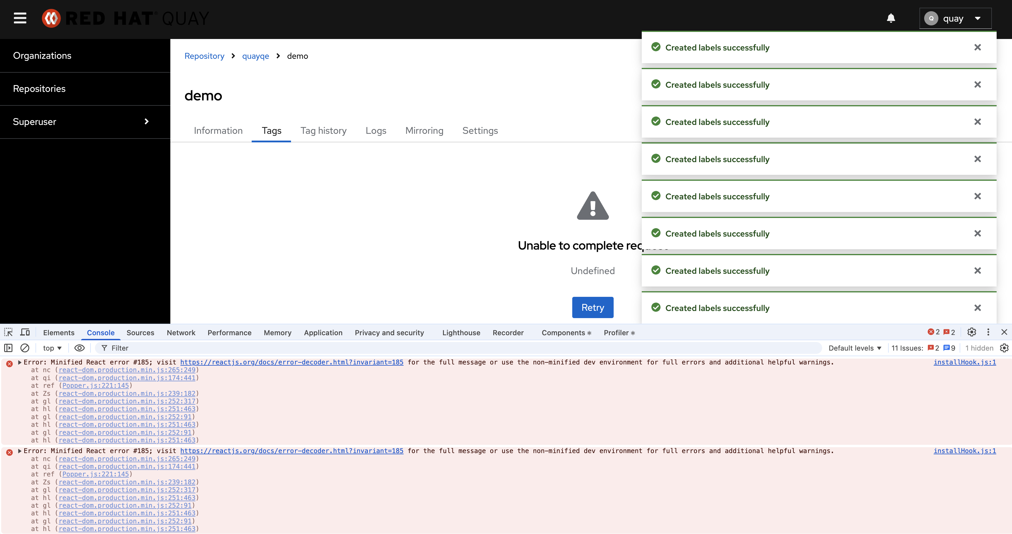 - Reserved label prefix (quay.* labels restricted)