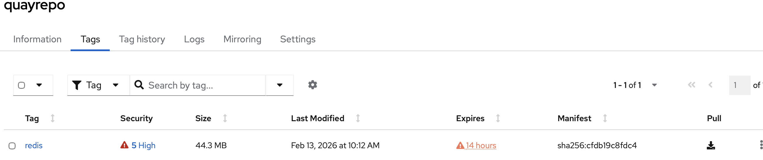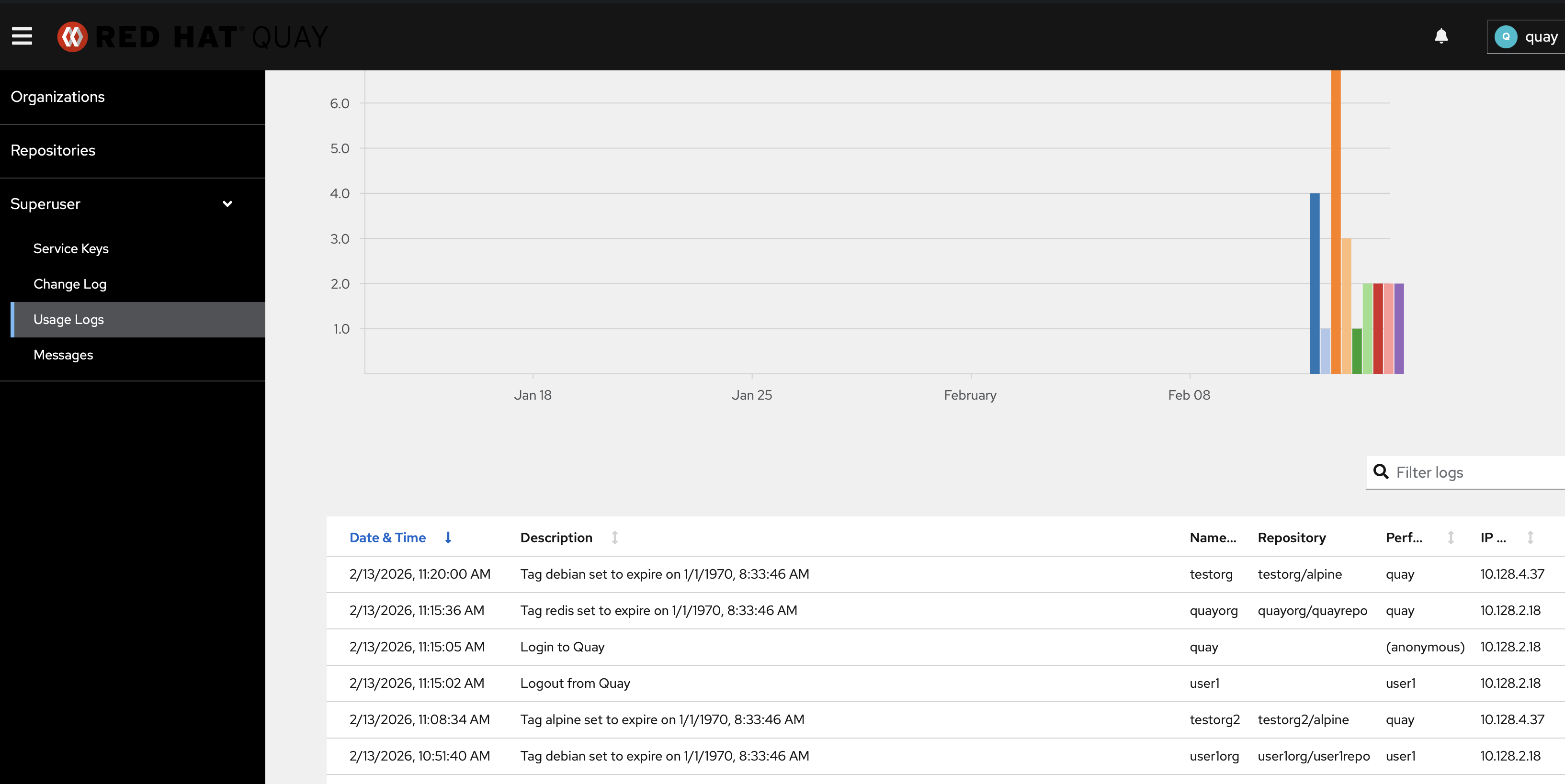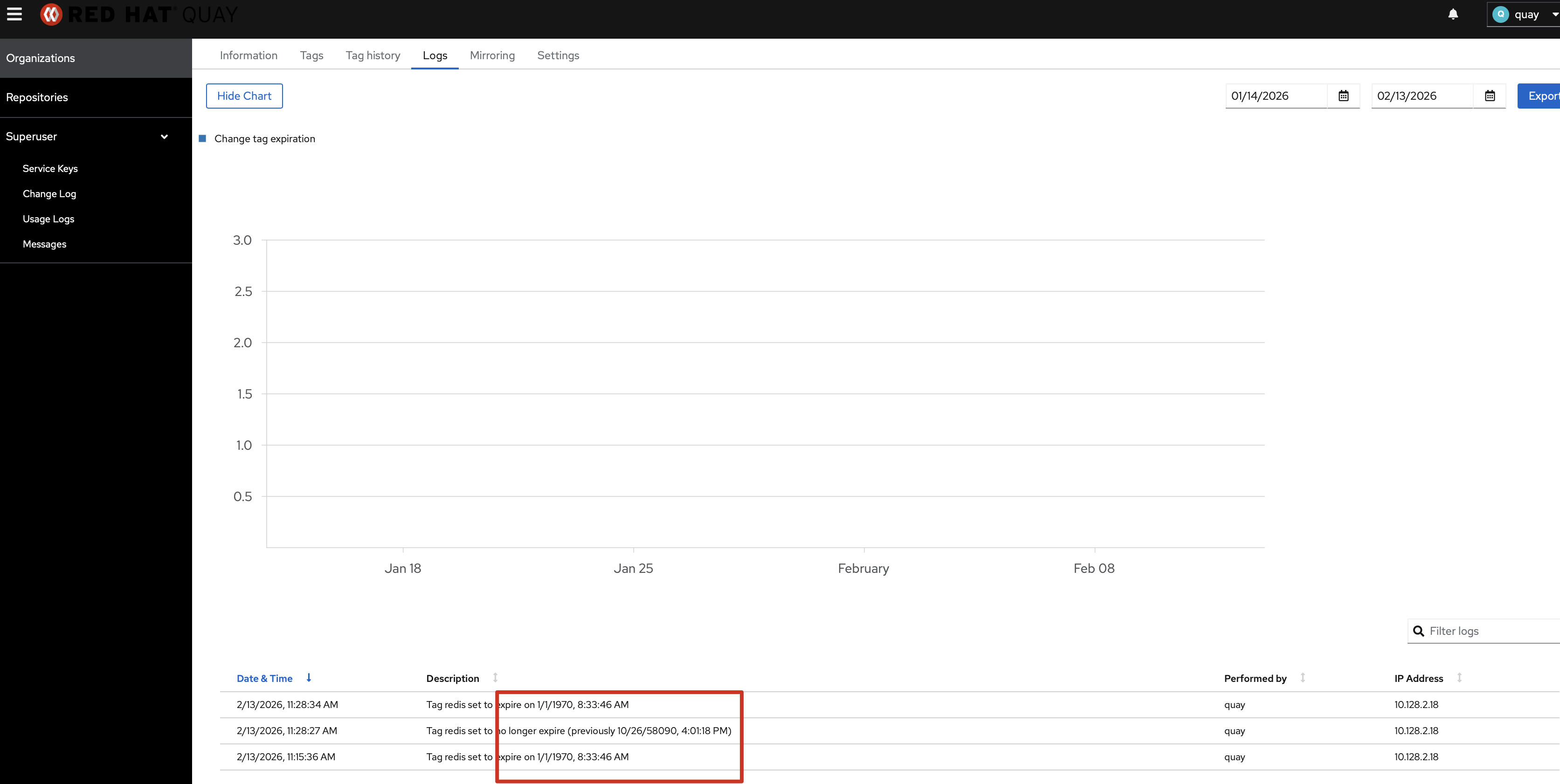 3:28:34.000 AM {"account": "quayorg", "datetime": "2026-02-13 03:28:34.805125", "ip": "10.128.2.18", "kind": "change_tag_expiration", "metadata_json": {"expiration_date": "2026-02-13 17:00:00", "namespace": "quayorg", "old_expiration_date": null, "repo": "quayrepo", "tag": "redis", "username": "quay"}, "performer": "quay", "repository": "quayrepo"}