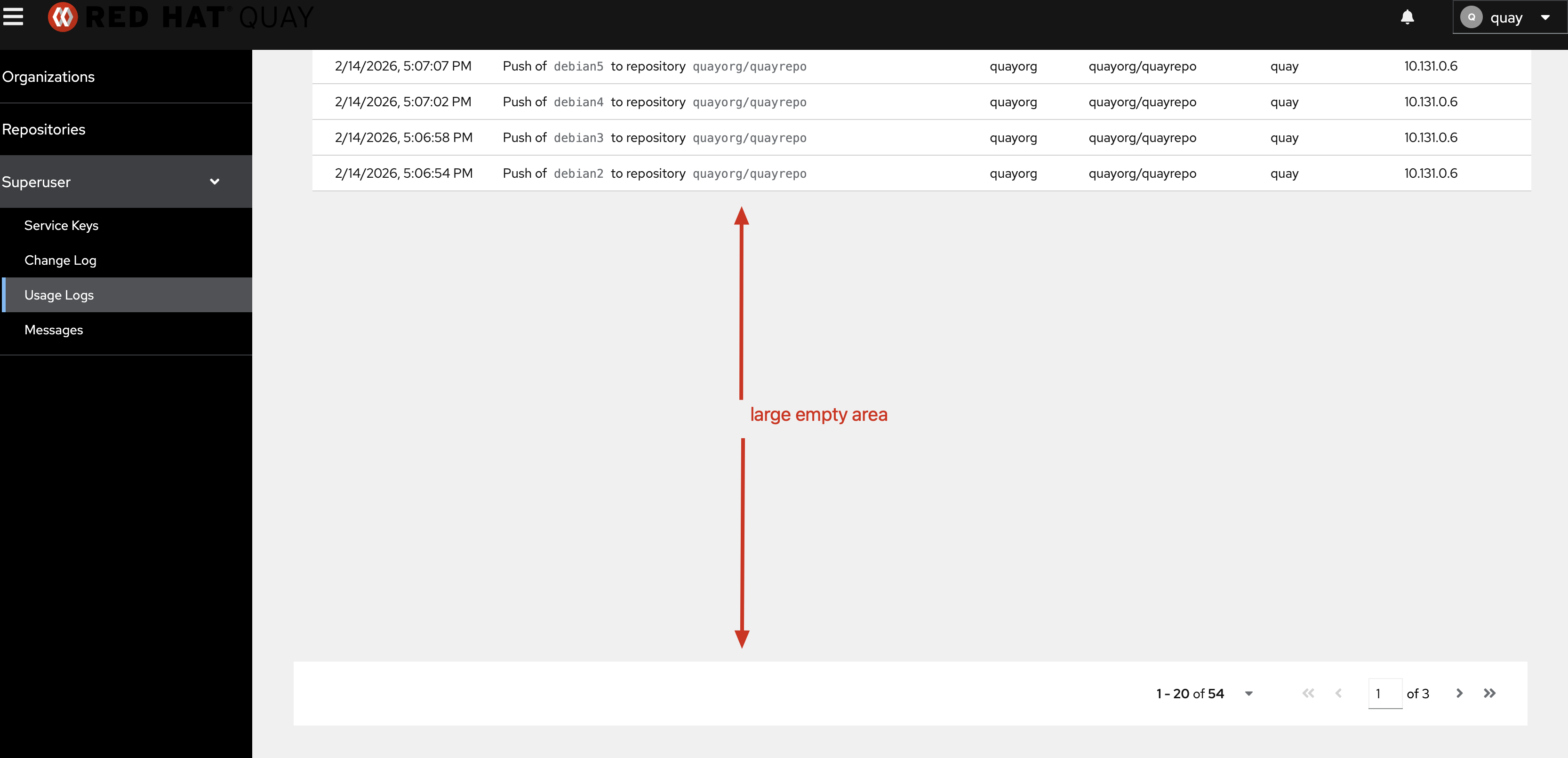 this cause large size of UI empty. and I find only in the page, we have a fixed footer bar at the bottom of page, in Organizations/Repositories page, the pagination widget if along with above table, not fixed at the bottom of page.