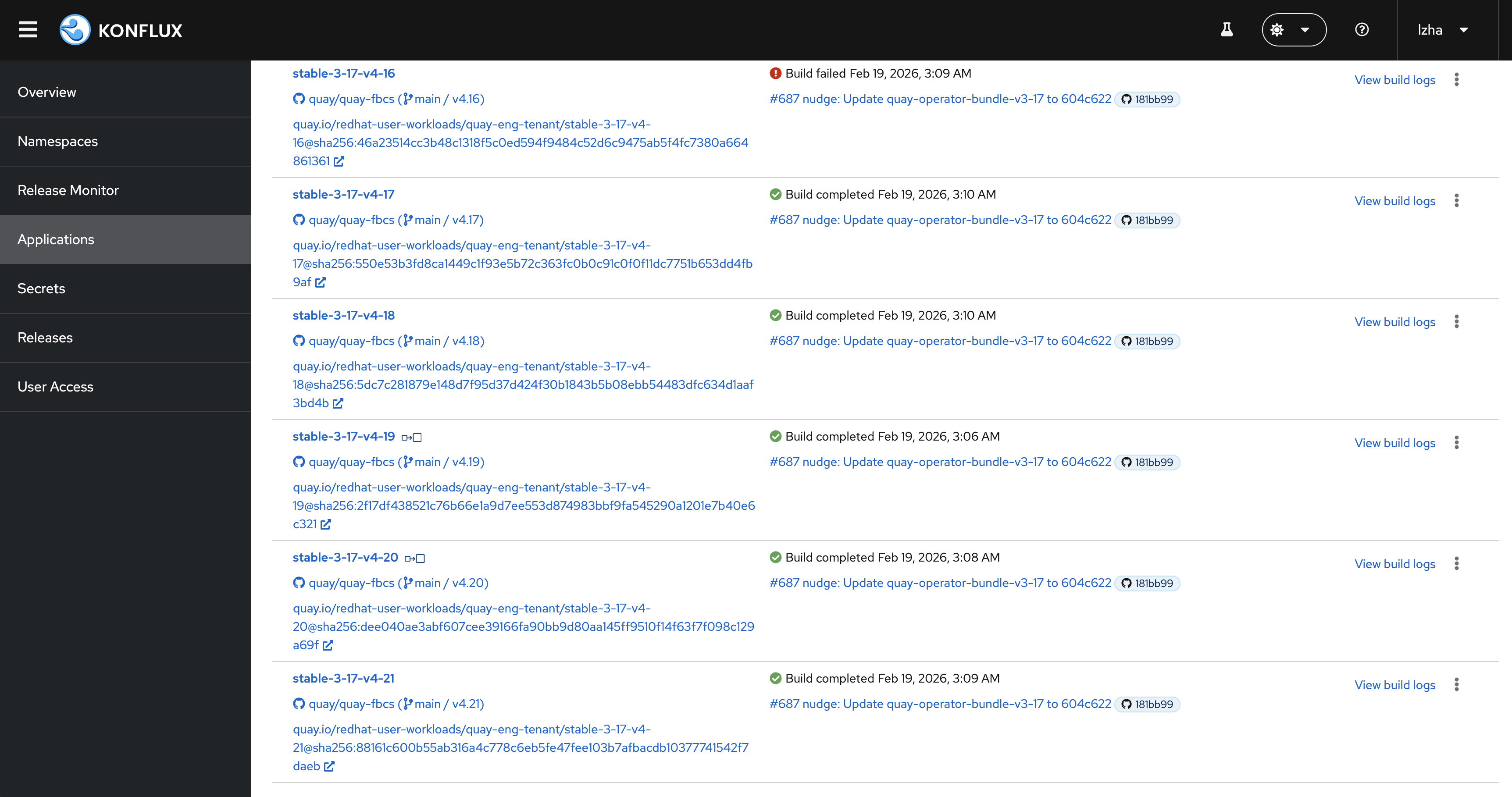 oc get pod NAME READY STATUS RESTARTS AGE quay-operator.v3.17.0-7bb9c55945-d2qtq 1/1 Running 0 19m quayregistry-clair-app-7df6597757-5sz68 1/1 Running 0 5m8s quayregistry-clair-app-7df6597757-5vs98 1/1 Running 5 (6m38s ago) 8m9s quayregistry-clair-app-7df6597757-5xp7s 1/1 Running 5 (6m42s ago) 8m9s quayregistry-clair-app-7df6597757-mrlzs 1/1 Running 0 5m19s quayregistry-clair-app-7df6597757-rnhpr 1/1 Running 0 4m59s quayregistry-clair-app-7df6597757-ssgkf 1/1 Running 5 (6m31s ago) 8m10s quayregistry-clair-app-7df6597757-v5stv 1/1 Running 0 5m8s quayregistry-clair-app-7df6597757-xg6rf 1/1 Running 5 (6m37s ago) 8m10s quayregistry-clair-postgres-847b544d-p76pt 1/1 Running 0 7m39s quayregistry-quay-app-upgrade-9vx7j 0/1 Error 4 (64s ago) 106s quayregistry-quay-database-b88d9dfb-nvl77 1/1 Running 0 8m9s quayregistry-quay-mirror-dfd6f8dc7-jtpb9 0/1 Init:CrashLoopBackOff 6 (2m37s ago) 8m9s quayregistry-quay-mirror-dfd6f8dc7-tb8bq 0/1 Init:CrashLoopBackOff 6 (2m29s ago) 8m9s quayregistry-quay-redis-549747b574-vjdxn 1/1 Running 0 8m10s oc logs quayregistry-quay-app-upgrade-9vx7j __ __ / \ / \ ______ _ _ __ __ __ / /\ / /\ \ / __ \ | | | | / \ \ \ / / / / / / \ \ | | | | | | | | / /\ \ \ / \ \ \ \ / / | |__| | | |__| | / ____ \ | | \ \/ \ \/ / \_ ___/ \____/ /_/ \_\ |_| \__/ \__/ \ \__ \___\ by Red Hat Build, Store, and Distribute your Containers Startup timestamp: Sun Feb 22 05:58:17 PM UTC 2026 Installing extra certificates found in /quay-registry/conf/stack/extra_ca_certs directory Entering migration mode to version: head Traceback (most recent call last): File "/opt/app-root/bin/alembic", line 5, in <module> from alembic.config import main ModuleNotFoundError: No module named 'alembic'