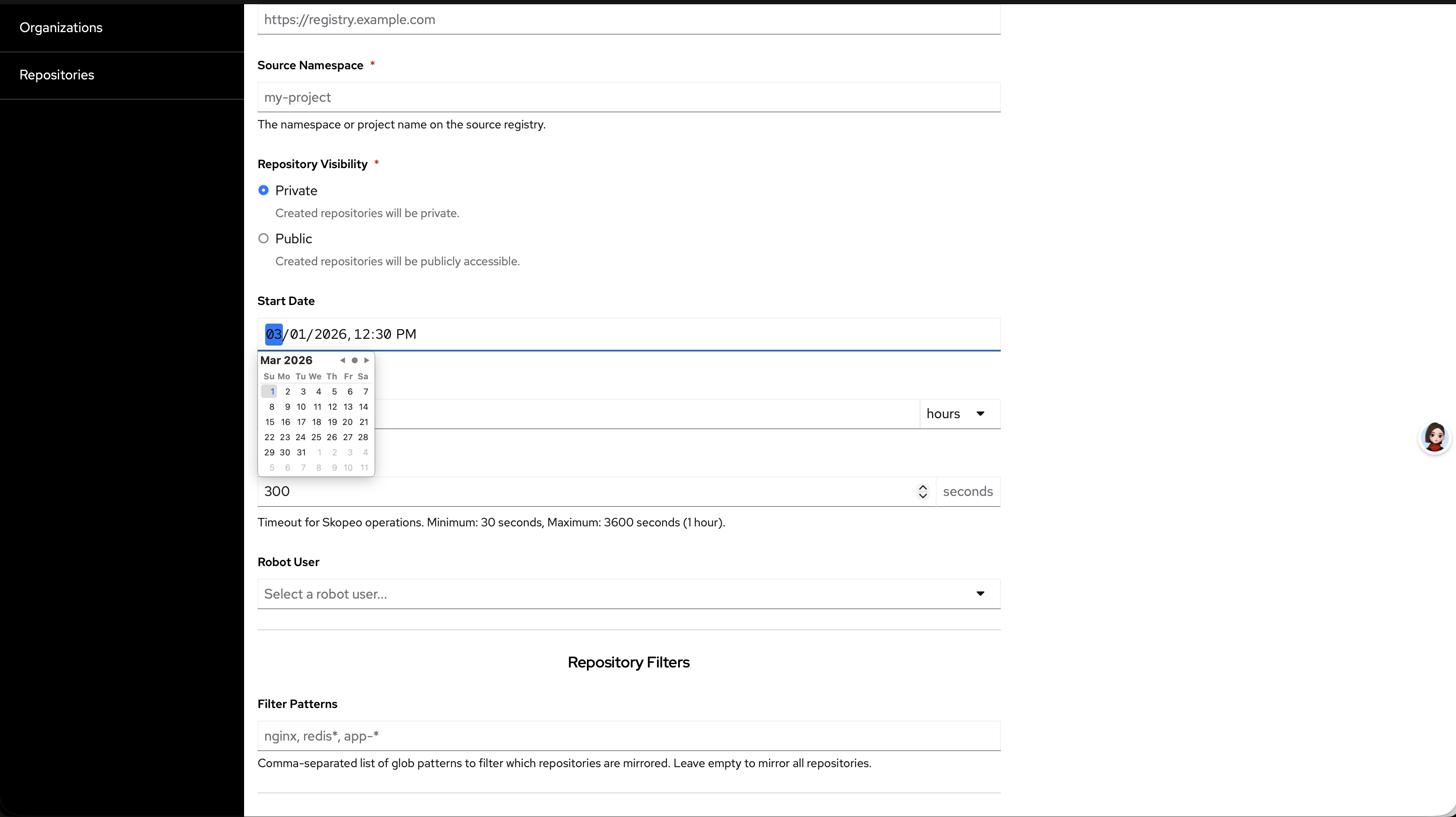 The "Start Date" dropdown calendar in the Organization Mirror form does not work correctly in Firefox and Safari. There are no hour or minute options. But there should be.