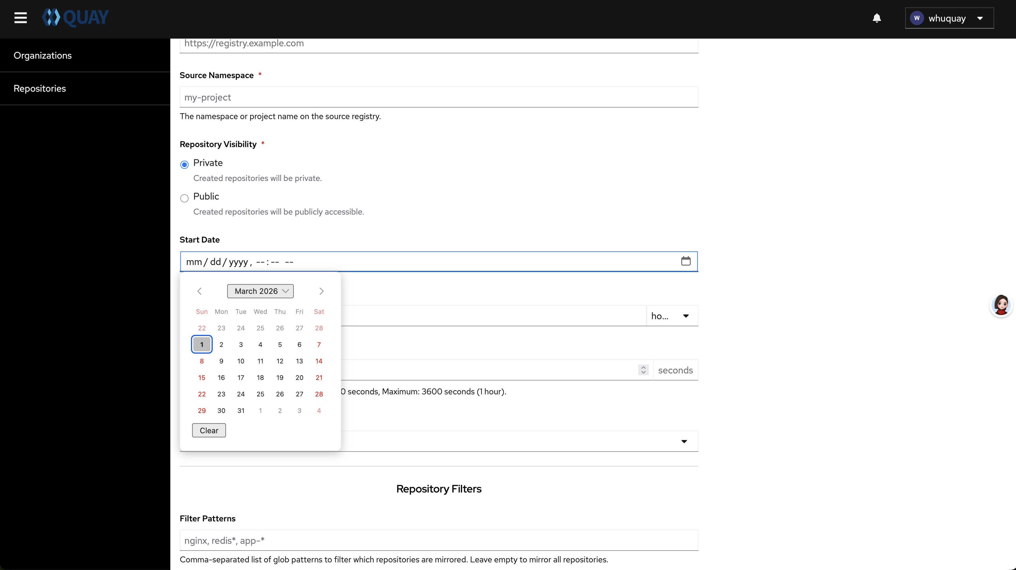 The "Start Date" dropdown calendar in Firefox