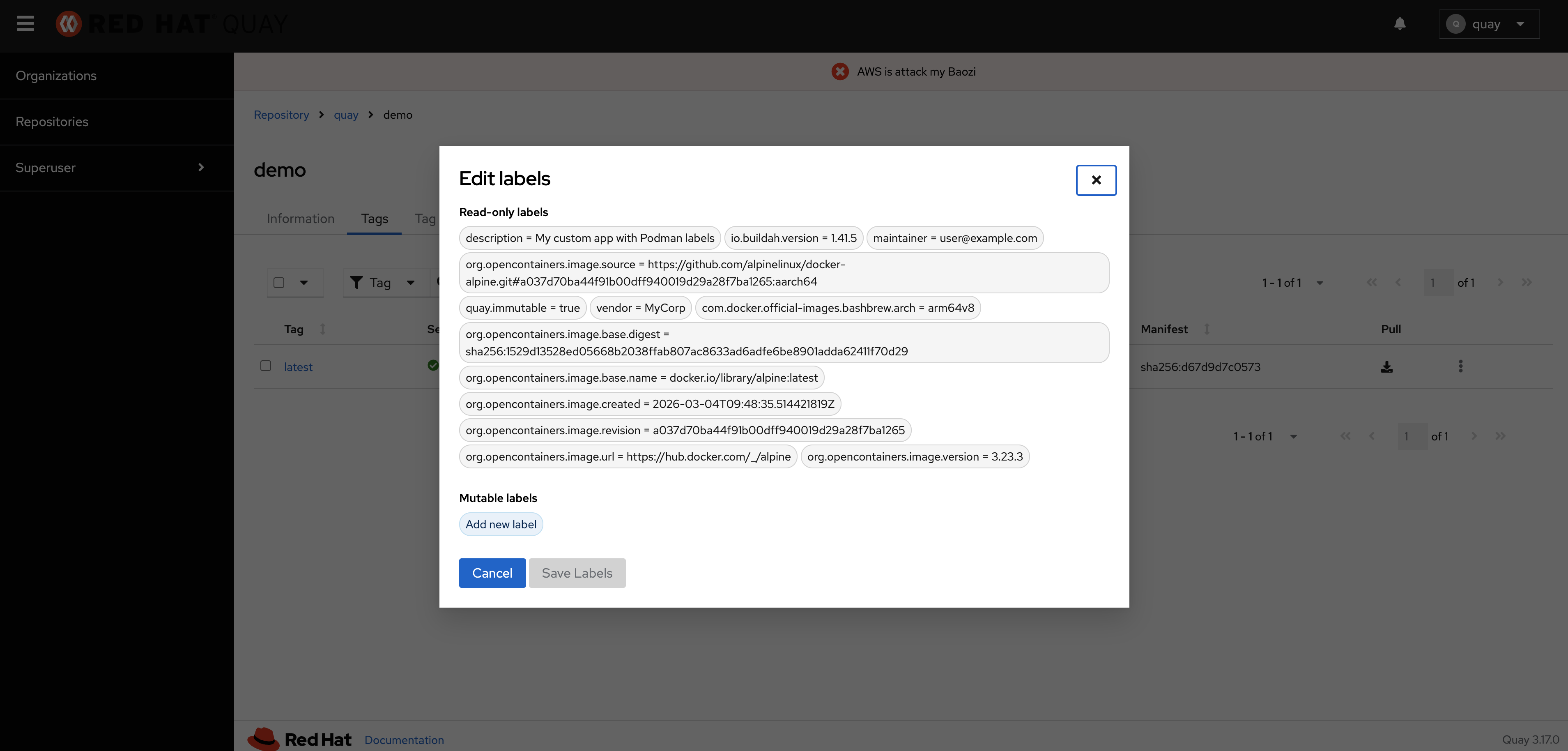 podman build --label quay.immutable=true -t quay.io/myorg/app:v1.0 . docker build --label quay.immutable=true -t quay.io/myorg/app:v1.0 .