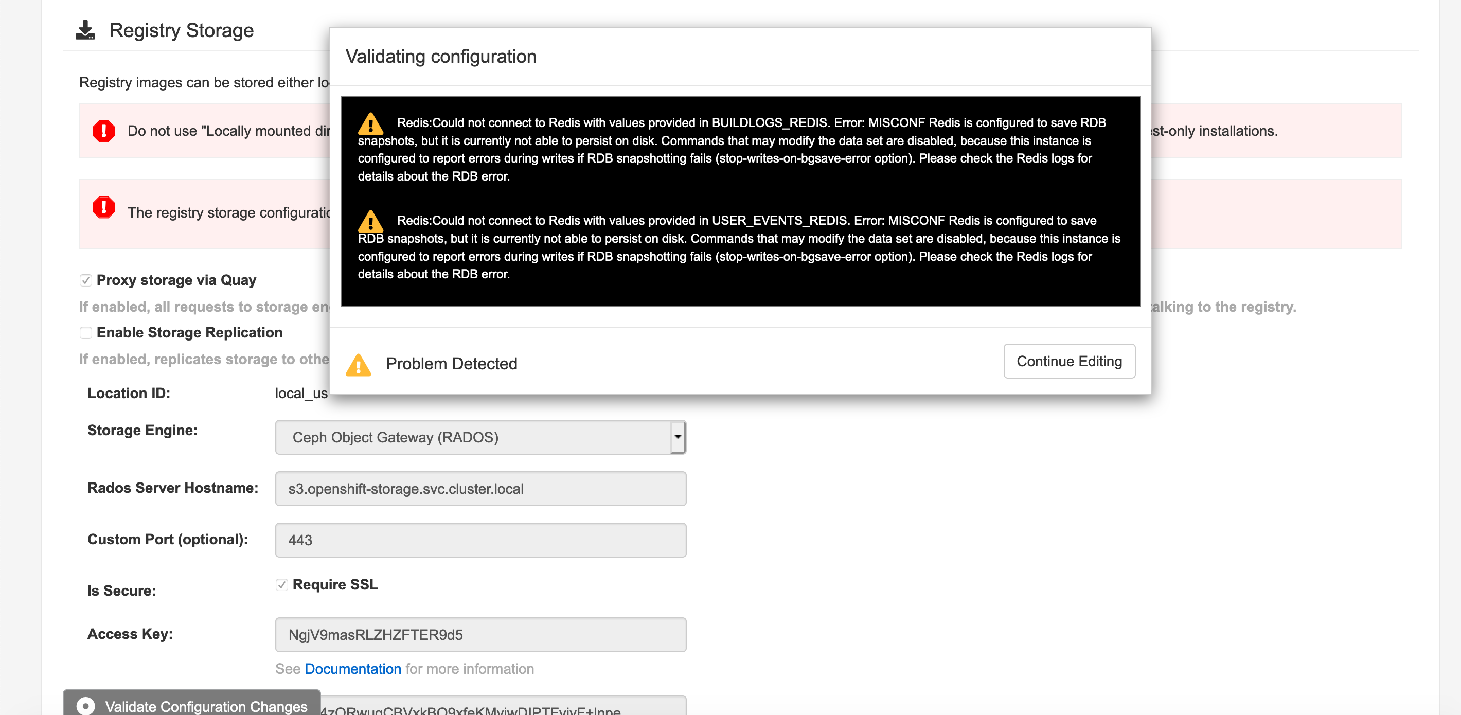 Quay config editor was failed to save configurations with Redis error