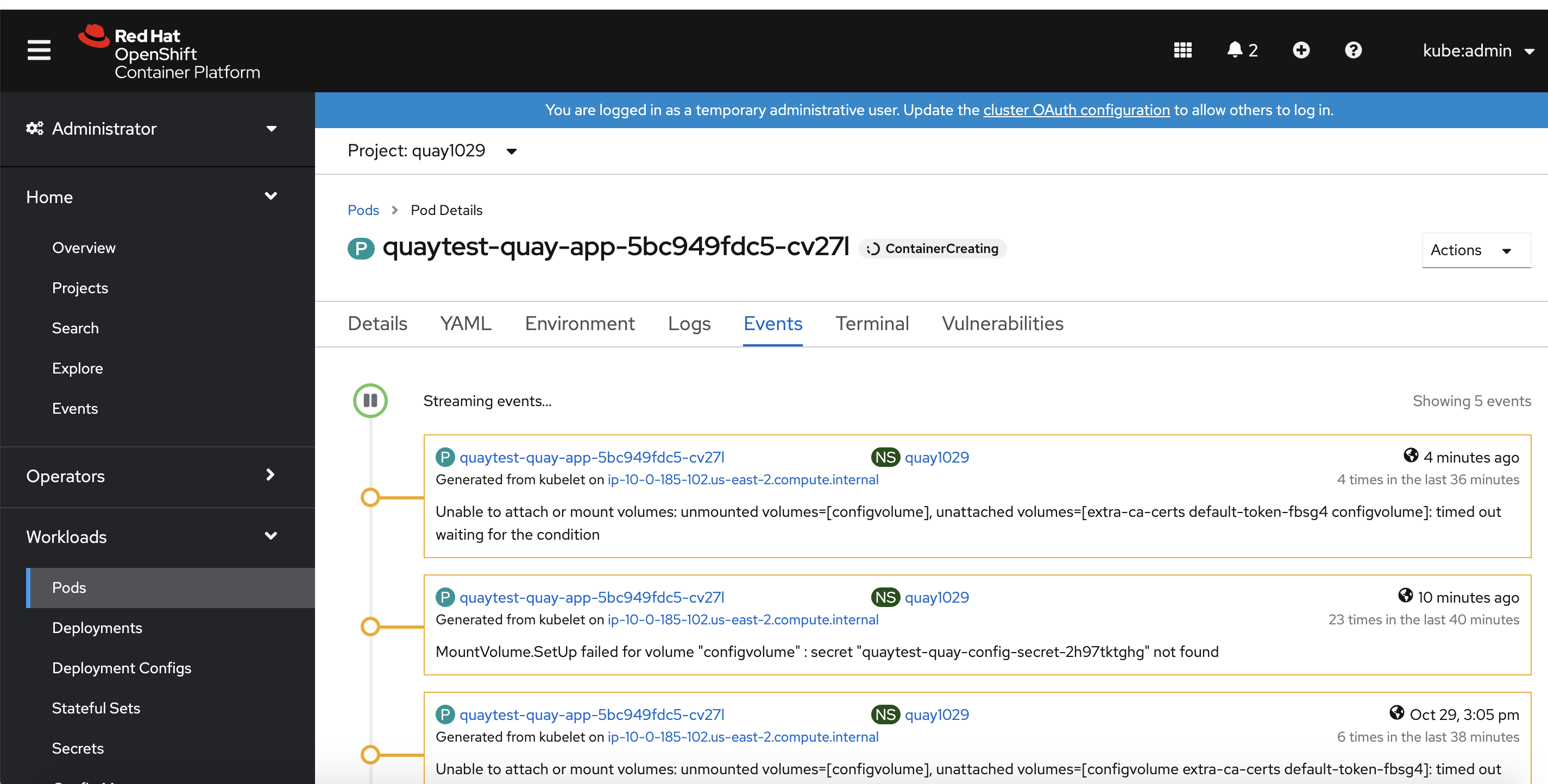 MountVolume.SetUp failed for volume "configvolume" : secret "quaytest-quay-config-secret-2h97tktghg" not found