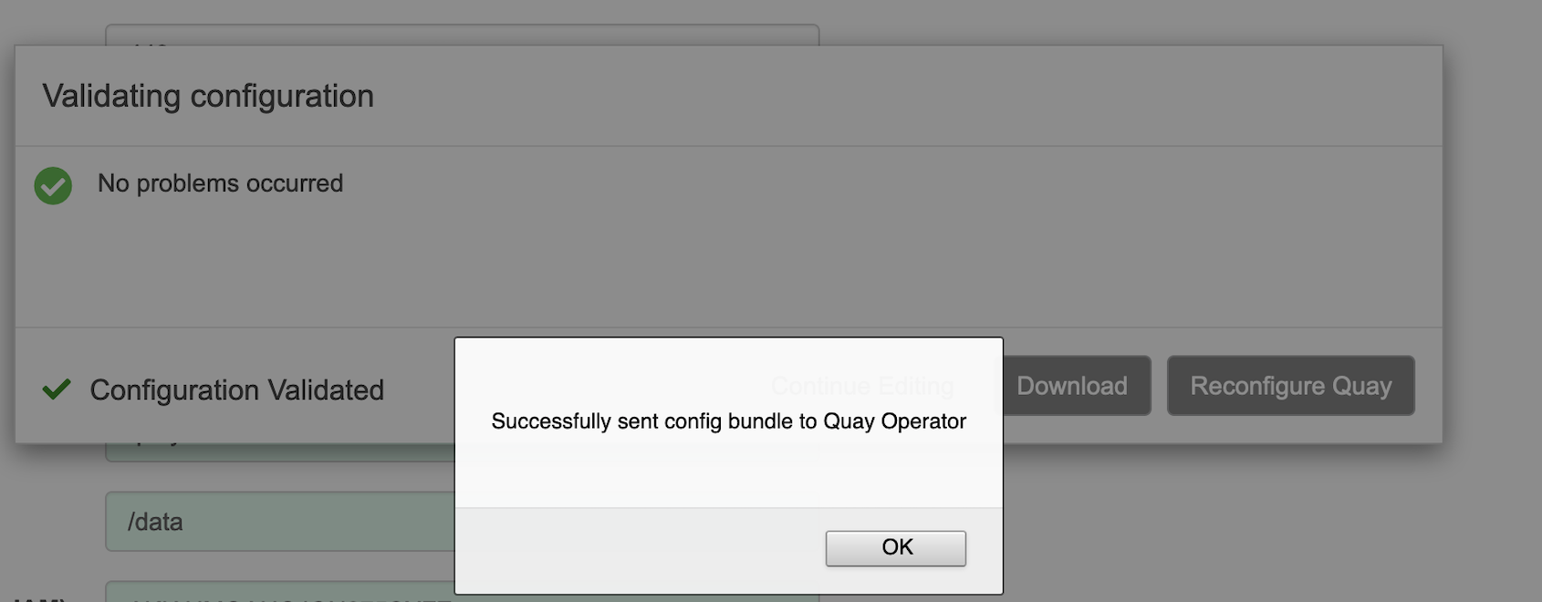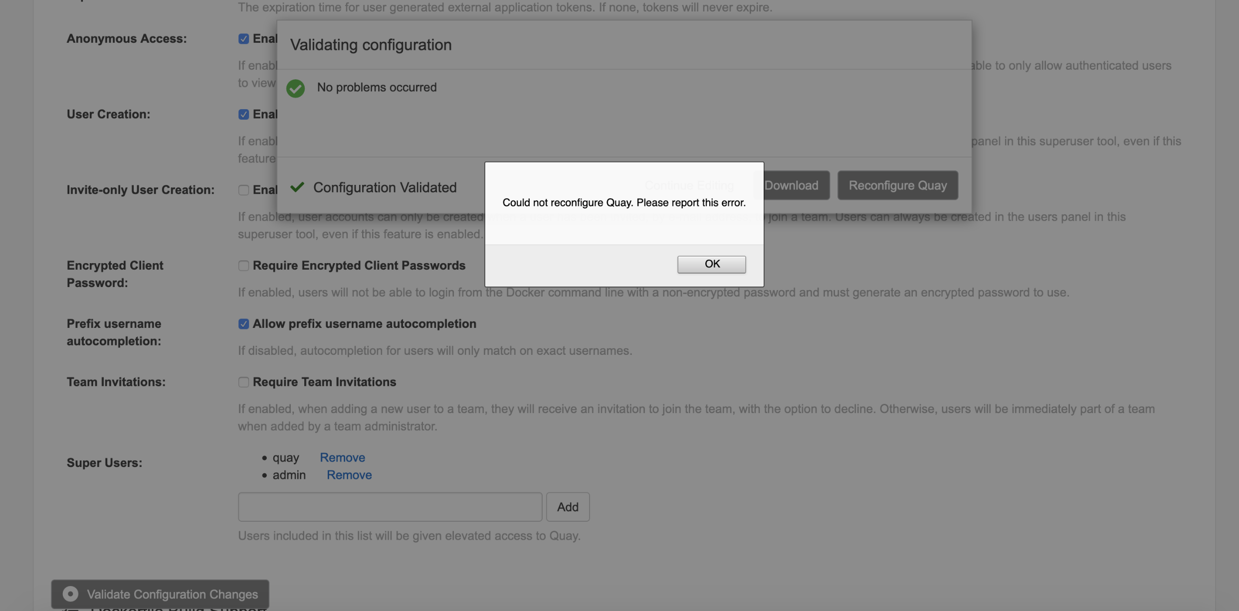 - Click "Reconfigure Quay"