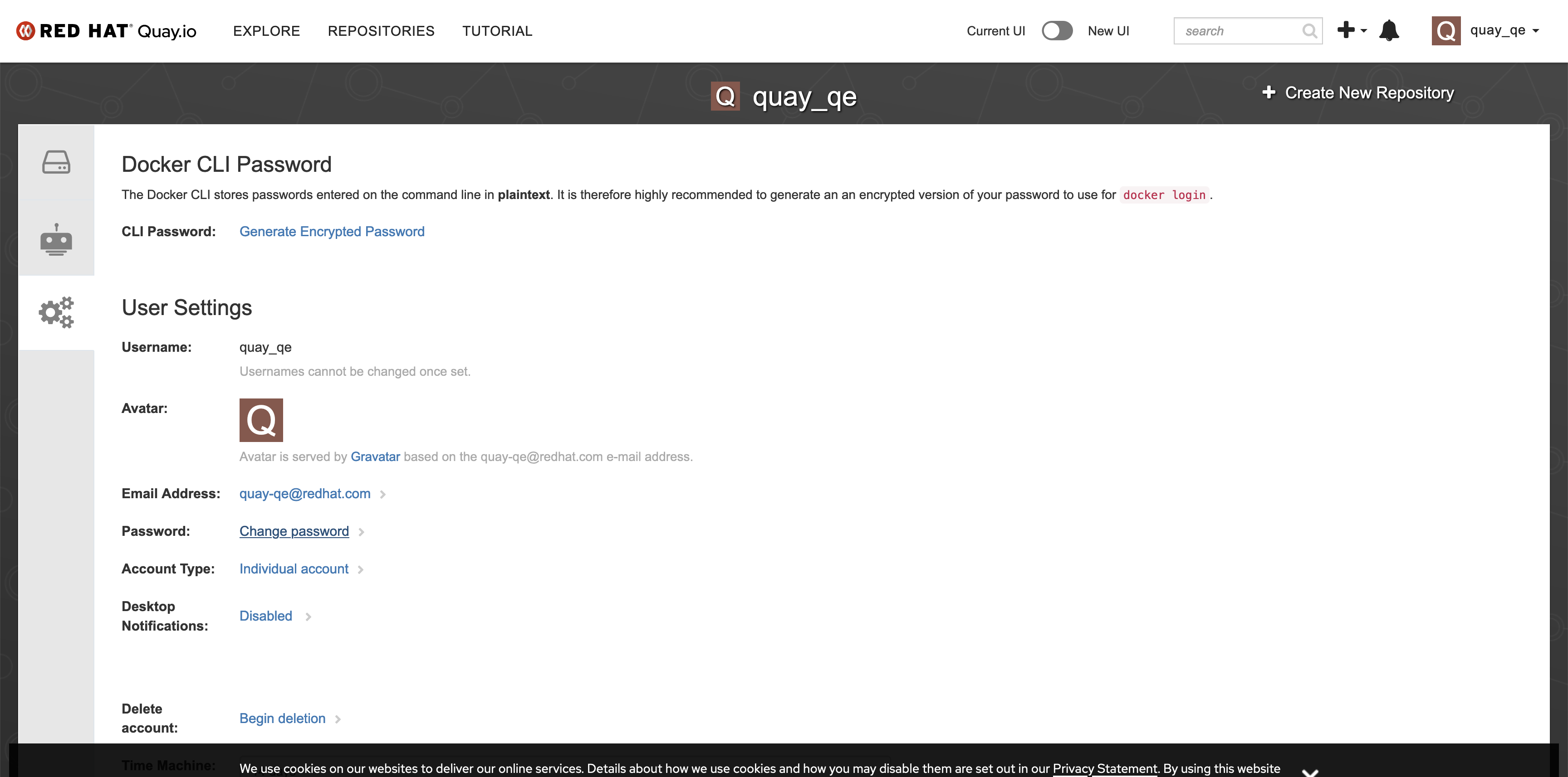This is an issue found in Stage Hybrid Cloud Console, now after user login with Redhat SSO, there's no way to set the password of login with Docker or Podman Client Tool, compared with Stage.quay.io, user can set password on the account settings page. Pls review this issue.