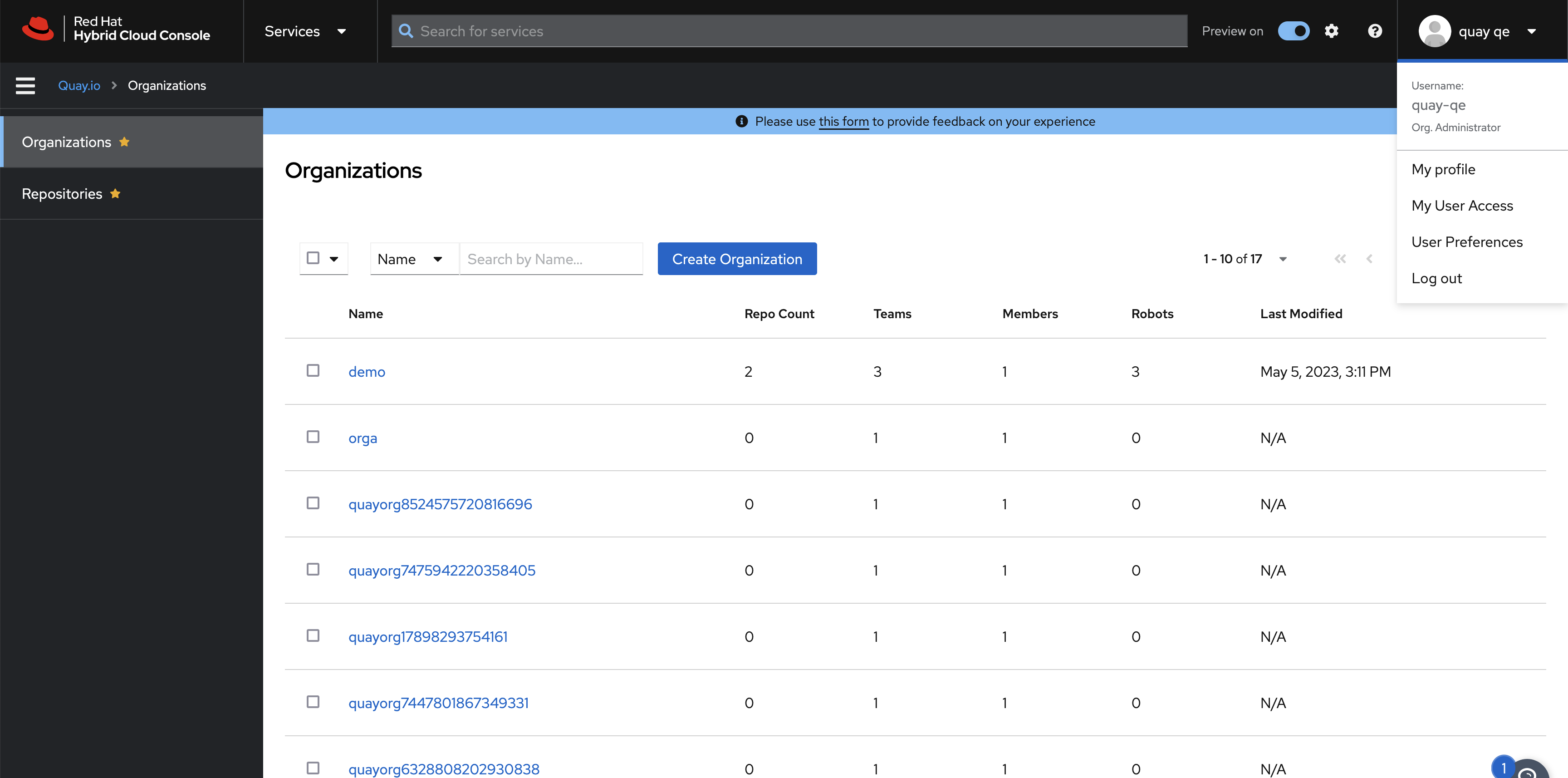 ENV: https://console.stage.redhat.com/preview/quay/organization