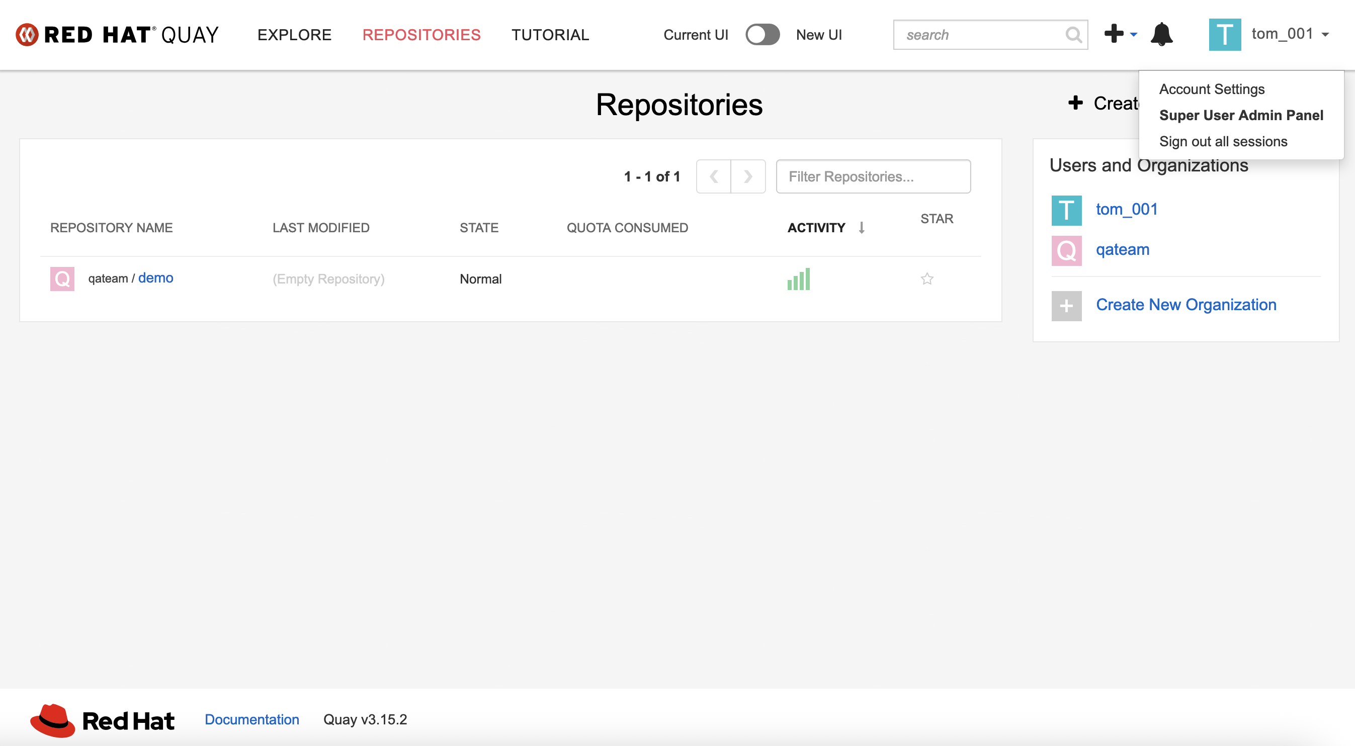 - Log onto Quay as a user which is expected to be a superuser