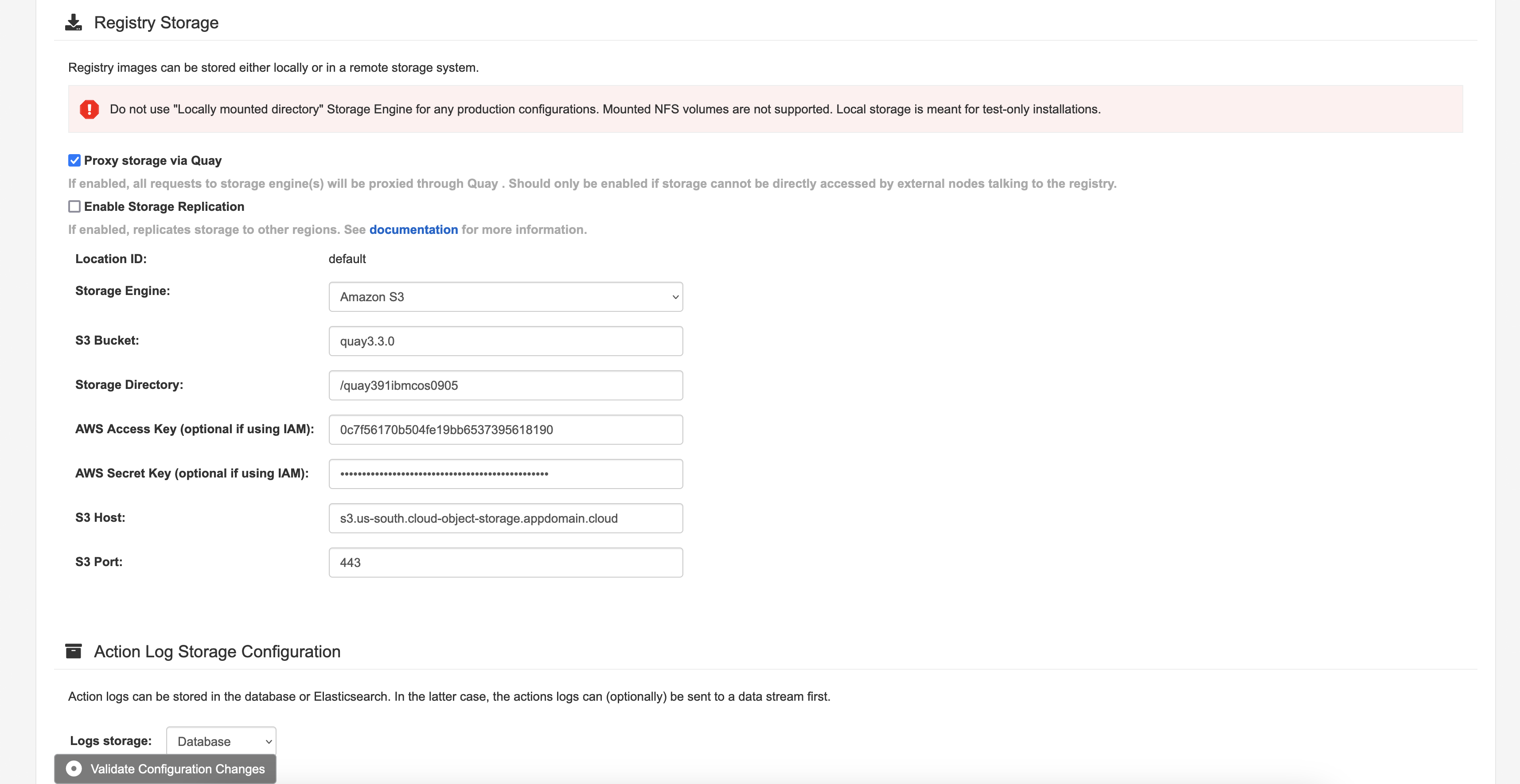 ALLOW_PULLS_WITHOUT_STRICT_LOGGING: false ALLOWED_OCI_ARTIFACT_TYPES: application/vnd.cncf.helm.config.v1+json: - application/tar+gzip application/vnd.oci.image.layer.v1.tar+gzip+encrypted: - application/vnd.oci.image.layer.v1.tar+gzip+encrypted AUTHENTICATION_TYPE: Database BUILDLOGS_REDIS: host: quay3910-quay-redis port: 6379 CREATE_NAMESPACE_ON_PUSH: true DATABASE_SECRET_KEY: UxVz0ZFiPqob2nUGHFeP5sDMwS4w7aENyXCdJOopypxUYEcXnppPnBSPPC32dg4y0NOtIk2vF3094cGv DB_CONNECTION_ARGS: autorollback: true threadlocals: true DB_URI: postgresql://quay3910-quay-database:SaZ34n3TpRNff2-ps19XGJQjymATJVndF6x8vZQwLhN17bKNFeO3EVBvzUXnuQtkGwquVfEK66B0NxYh@quay3910-quay-database:5432/quay3910-quay-database DEFAULT_TAG_EXPIRATION: 4w DISTRIBUTED_STORAGE_CONFIG: default: - S3Storage - host: s3.us-south.cloud-object-storage.appdomain.cloud maximum_chunk_size_gb: 2 port: "443" s3_access_key: ****** s3_bucket: quay3.3.0 s3_secret_key: ****** storage_path: /quay391ibmcos0905 DISTRIBUTED_STORAGE_DEFAULT_LOCATIONS: - default DISTRIBUTED_STORAGE_PREFERENCE: - default ENTERPRISE_LOGO_URL: /static/img/RH_Logo_Quay_Black_UX-horizontal.svg EXTERNAL_TLS_TERMINATION: true FEATURE_BUILD_SUPPORT: false FEATURE_DIRECT_LOGIN: true FEATURE_EXTENDED_REPOSITORY_NAMES: true FEATURE_GENERAL_OCI_SUPPORT: true FEATURE_HELM_OCI_SUPPORT: true FEATURE_MAILING: false FEATURE_PROXY_CACHE: true FEATURE_PROXY_STORAGE: true FEATURE_QUOTA_MANAGEMENT: true FEATURE_REPO_MIRROR: true FEATURE_SECURITY_NOTIFICATIONS: true FEATURE_SECURITY_SCANNER: true FEATURE_SUPERUSERS_FULL_ACCESS: true FEATURE_USER_INITIALIZE: true PREFERRED_URL_SCHEME: https REGISTRY_TITLE: Red Hat Quay REGISTRY_TITLE_SHORT: Red Hat Quay REPO_MIRROR_INTERVAL: 30 REPO_MIRROR_TLS_VERIFY: true SECRET_KEY: eCEsPkMiwwr7sMLZKXnxpebYXERLFcQTYCP3ld8XMJqJmdOBRNuFtDkjiZXqBt8R2Sgx6IliKg2haczD SECURITY_SCANNER_INDEXING_INTERVAL: 30 SECURITY_SCANNER_V4_ENDPOINT: http://quay3910-clair-app.quay-enterprise-1339.svc.cluster.local SECURITY_SCANNER_V4_NAMESPACE_WHITELIST: - admin SECURITY_SCANNER_V4_PSK: b3lsbjFoOTFoSGt5cXlRWHVncGhCU25VdU5yOWp1T2s= SERVER_HOSTNAME: quay3910-quay-quay-enterprise-1339.apps.quaytest-1339.qe.devcluster.openshift.com SETUP_COMPLETE: true SUPER_USERS: - quay - admin TAG_EXPIRATION_OPTIONS: - 2w - 4w - 8w TEAM_RESYNC_STALE_TIME: 60m TESTING: false USER_EVENTS_REDIS: host: quay3910-quay-redis port: 6379 USERFILES_LOCATION: default USERFILES_PATH: userfiles/