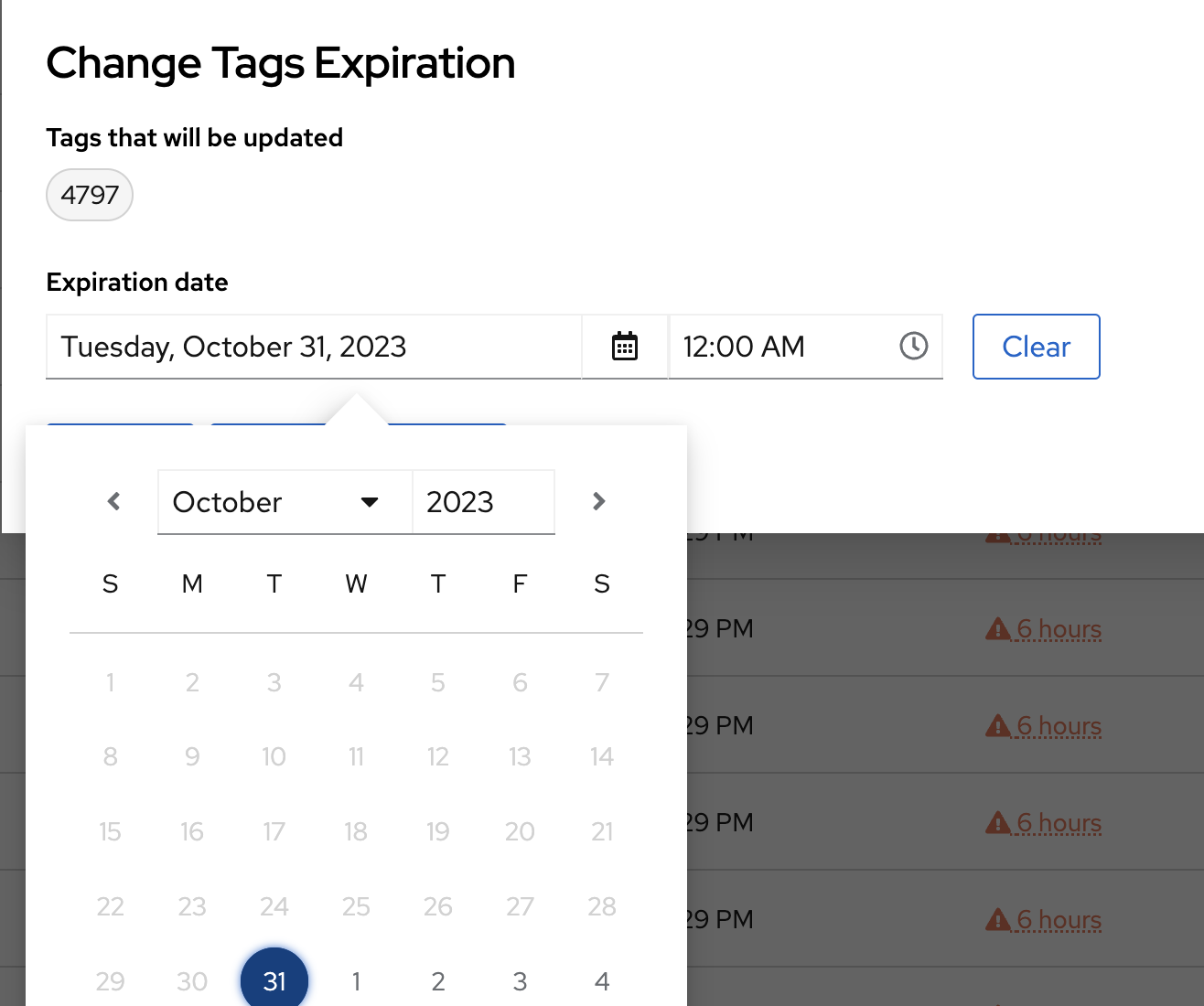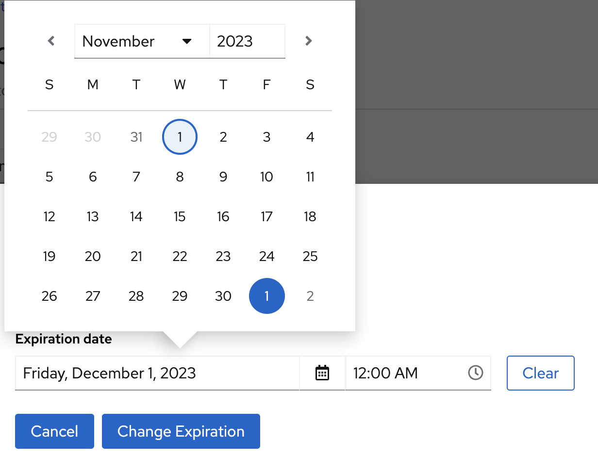 2, Click Expires link, here is " 6 hours" , open data picker to select next day, which is "Nov 1", but the picker set as "December 1, 2023"