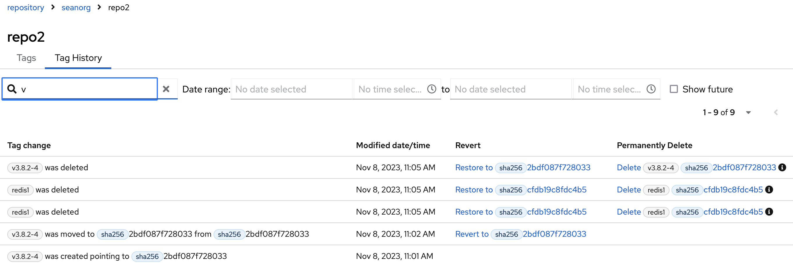 2, Delete the tags to generate event in Tag history page, here it delete by Auto-prune policy, manually delete tag doesn't have this problem.