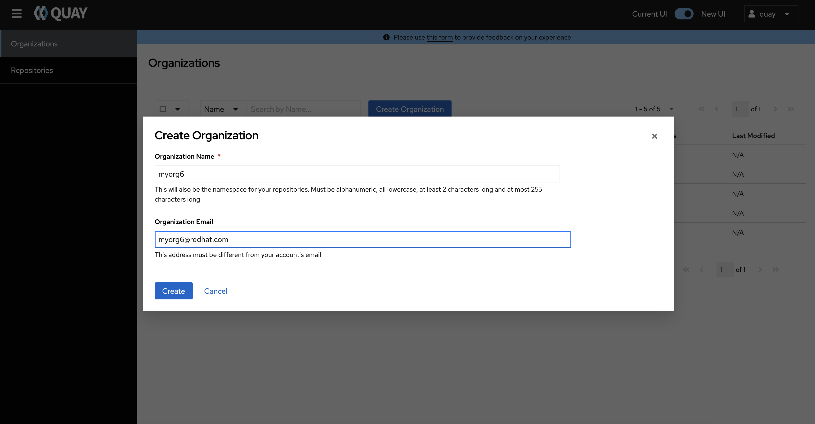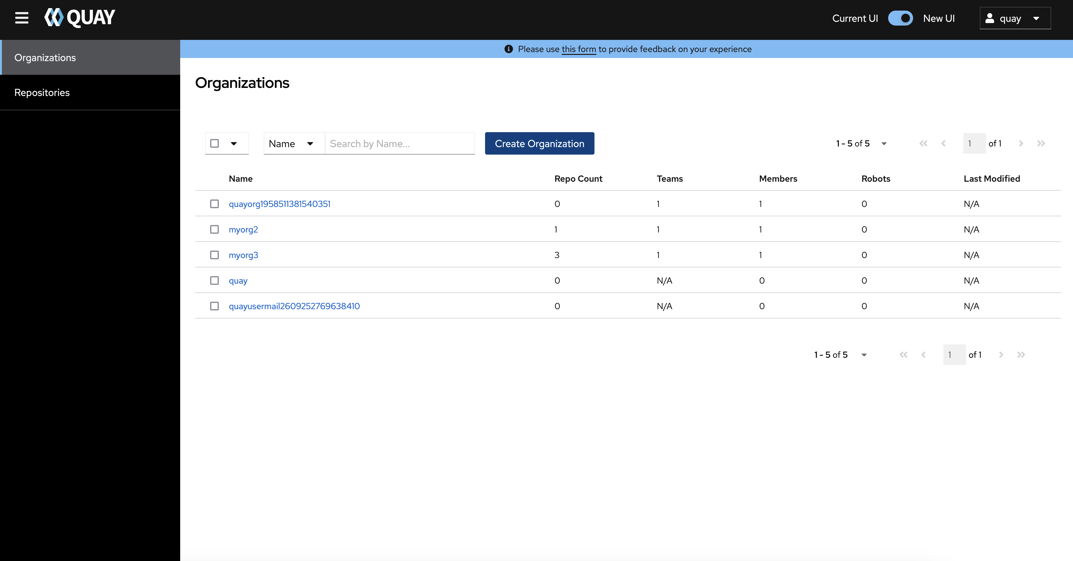 This is an issue found in Quay 3.10.1, after create new Quay Organization on new UI, the new organization is not displayed automatically on the Organizations Page, ideally Quay new UI should refresh the page automatically to show all organizations, pls review this issue.