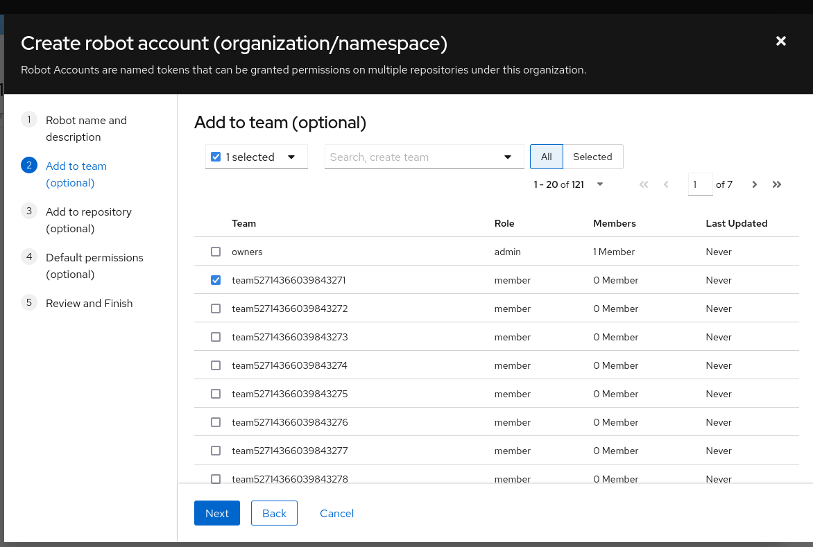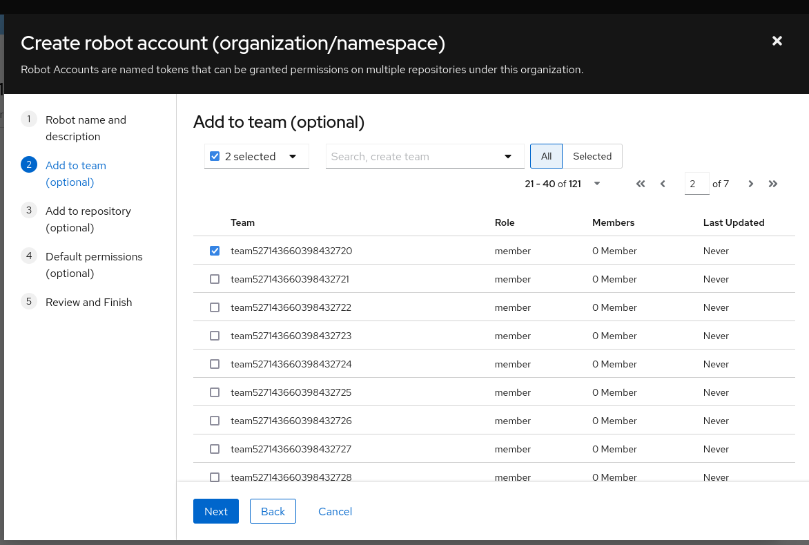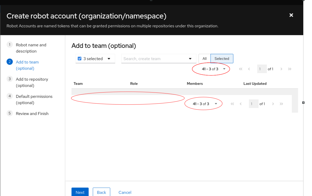 When checked team items in different page in Add to team tab of Create robot account wizard, the Selected button does't work as expected.