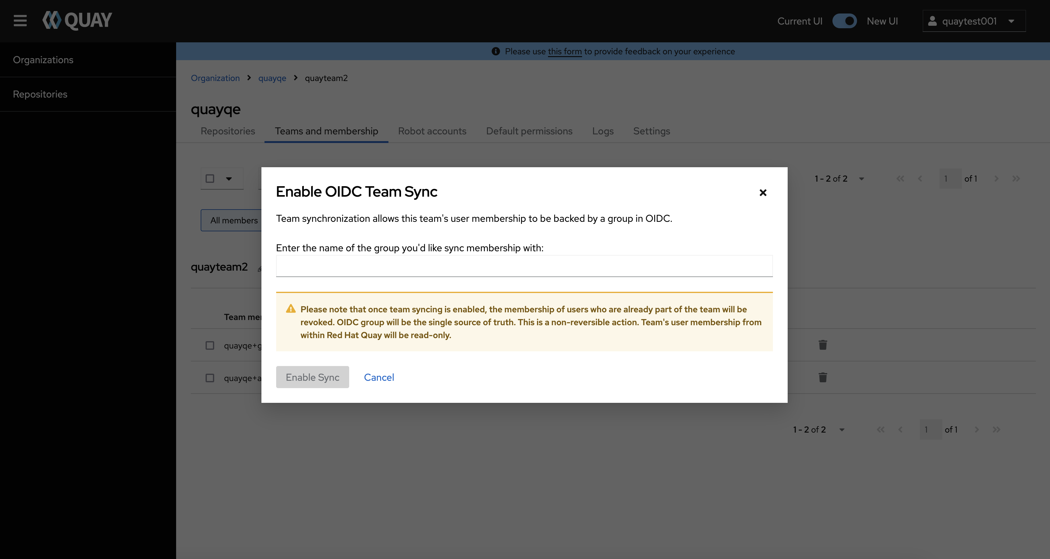 This is an issue found in Quay 3.11 new UI, when configured Quay to use LDAP Authentication, in the team sync click "Enable Team Sync", Quay new UI ask users to input the OIDC Group rather than LDAP Group, but on current UI, users can input the LDAP Group to config team sync, pls review this issue.