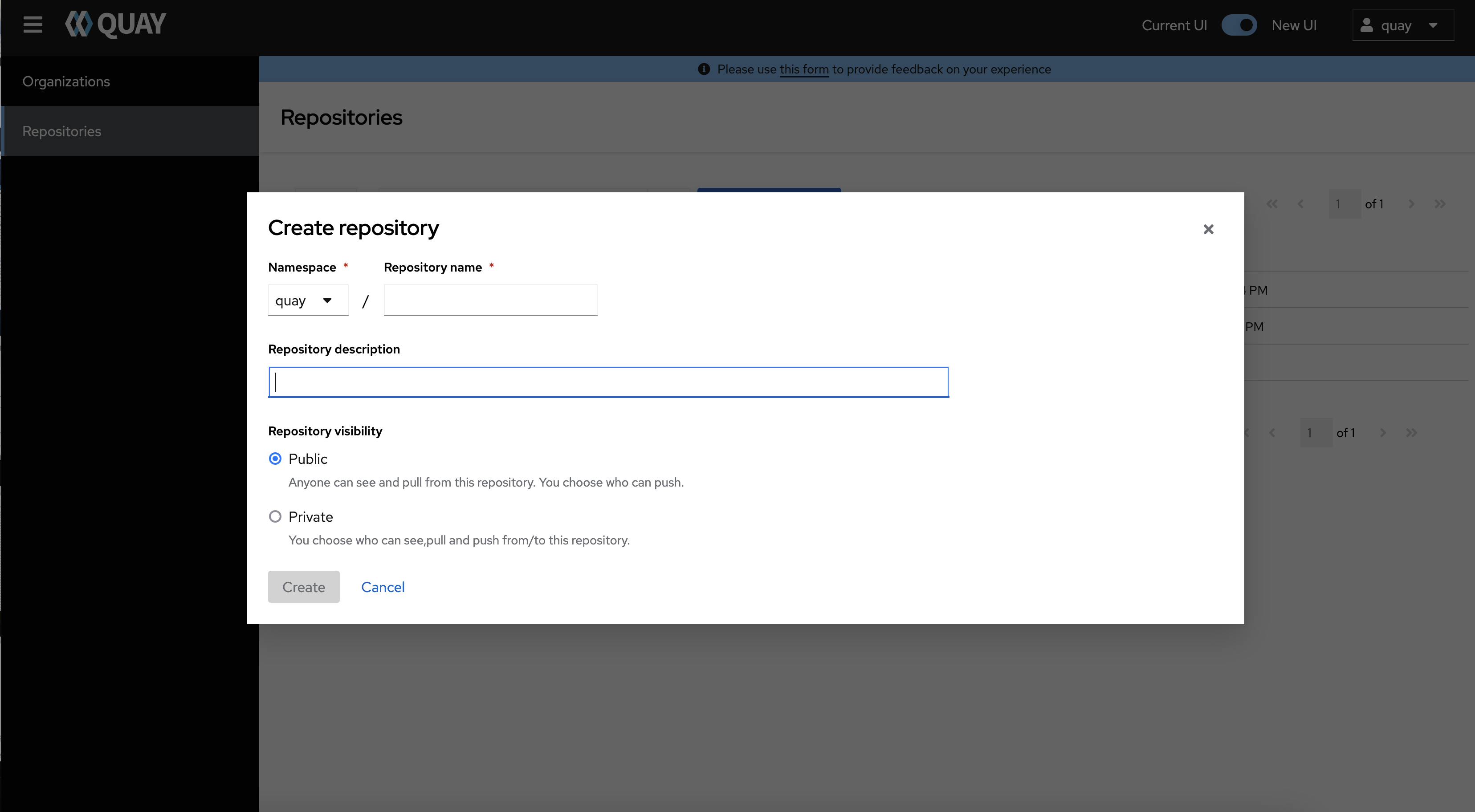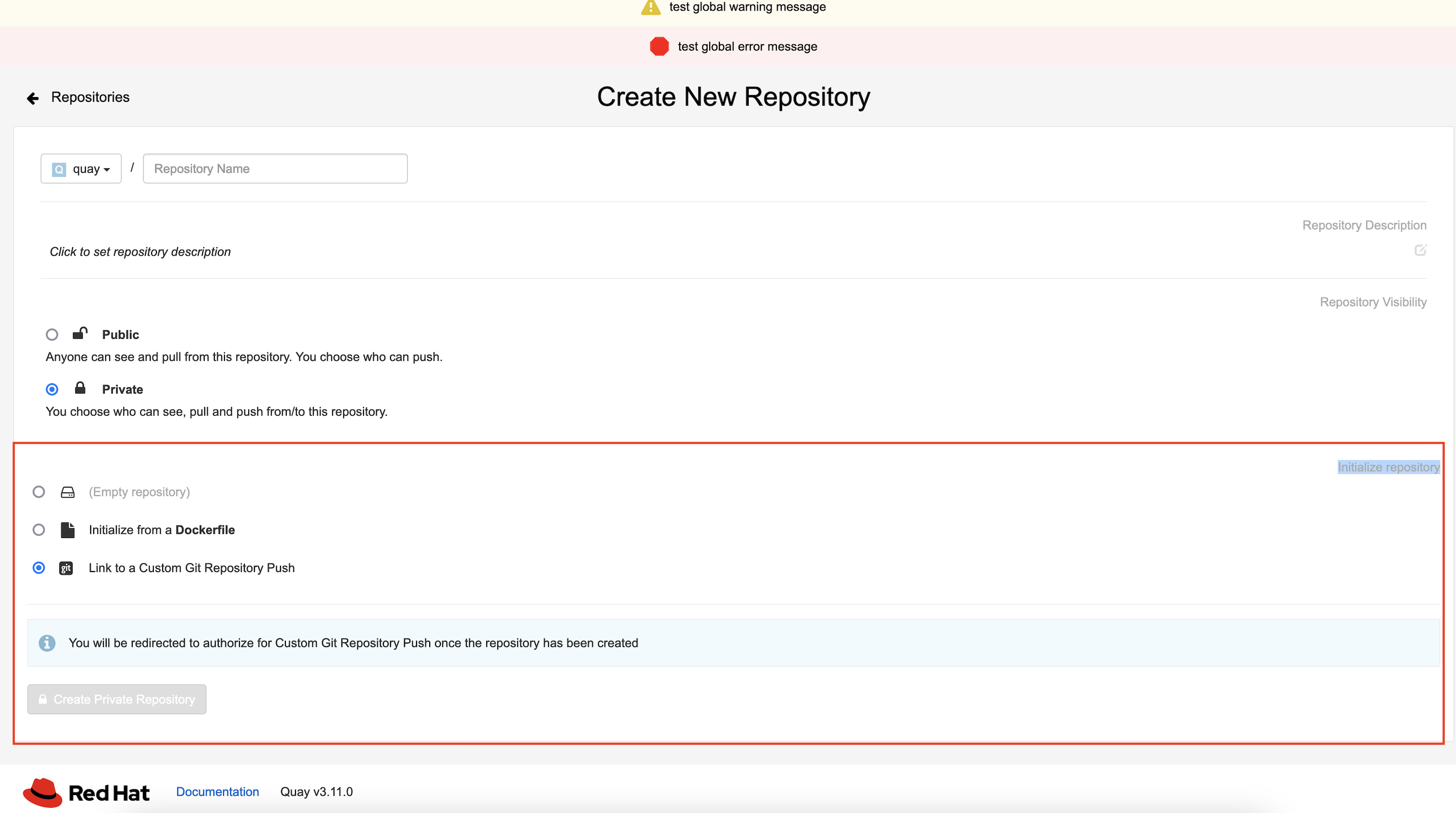 This is an issue found in Quay 3.11 new UI, in current UI when creating new image repository Quay Users can initialize repository from Dockerfile and Git repo, but Quay 3.11 new UI doesn't support this functionality, pls review this issues