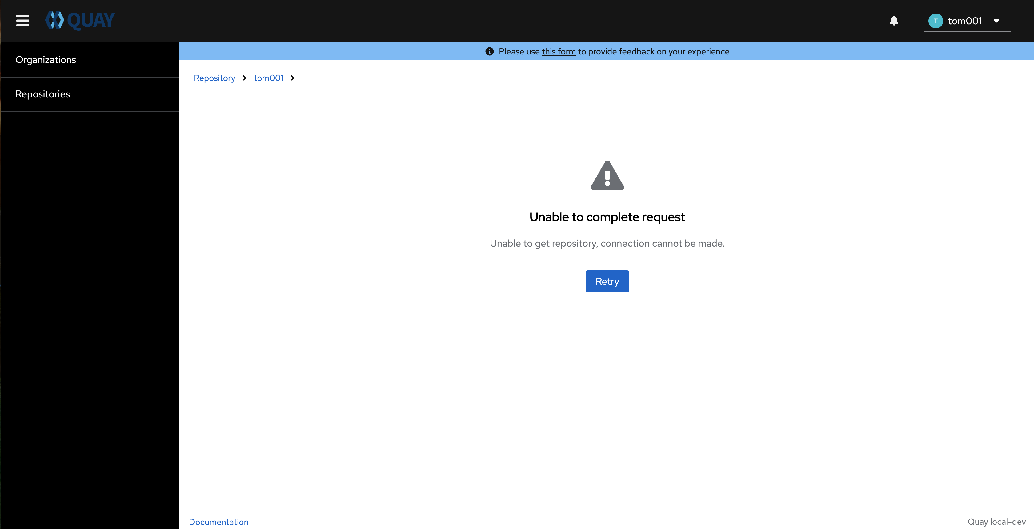 This is an issue found in Quay 3.11 new UI, after create Quay new Organization named build ,and create new image repository named build under this new organization, access this image repo from Current UI, it works well, but switch to Quay new UI, hit error "Unable to complete request", see the following screenshots, pls review this issue.