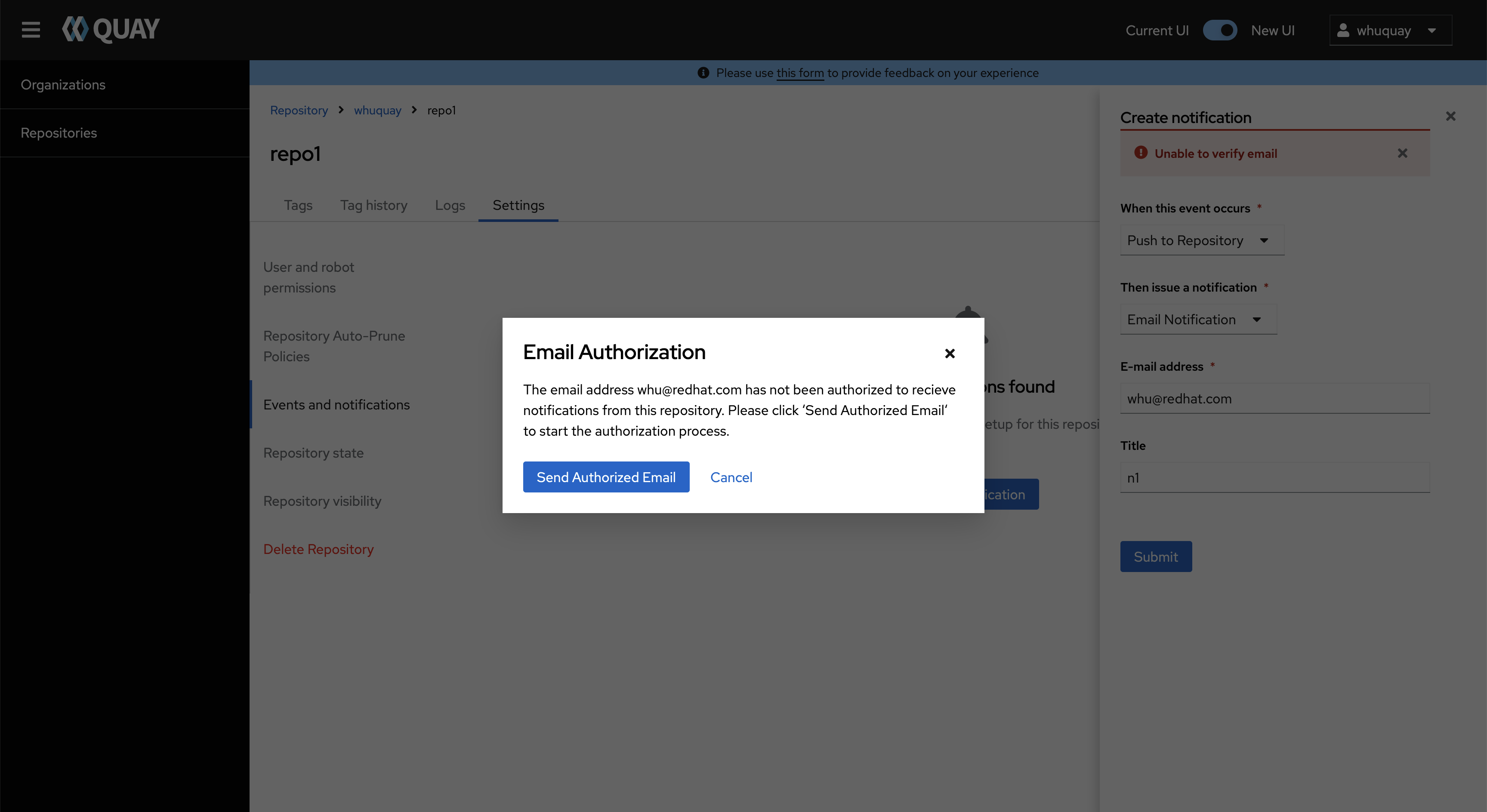 After click submit button, there is a popup to notice customer that quay will send out a authorization email to start the authorization process. it makes sense. But at this time, this danger alter "Unable to verify email" should not be displayed on the page, it doesn't make sense.