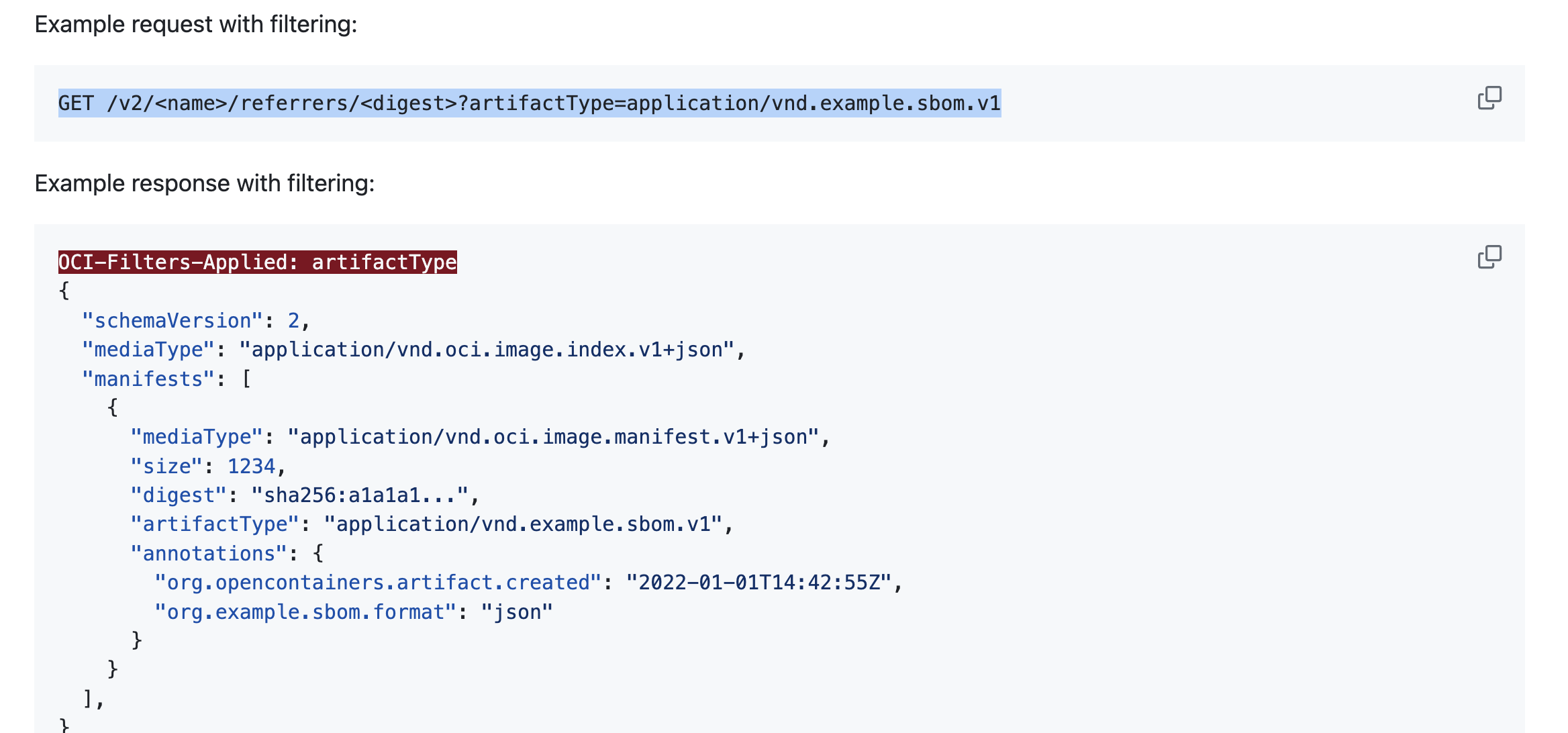 OCI Spec: https://github.com/opencontainers/distribution-spec/blob/main/spec.md#listing-referrers