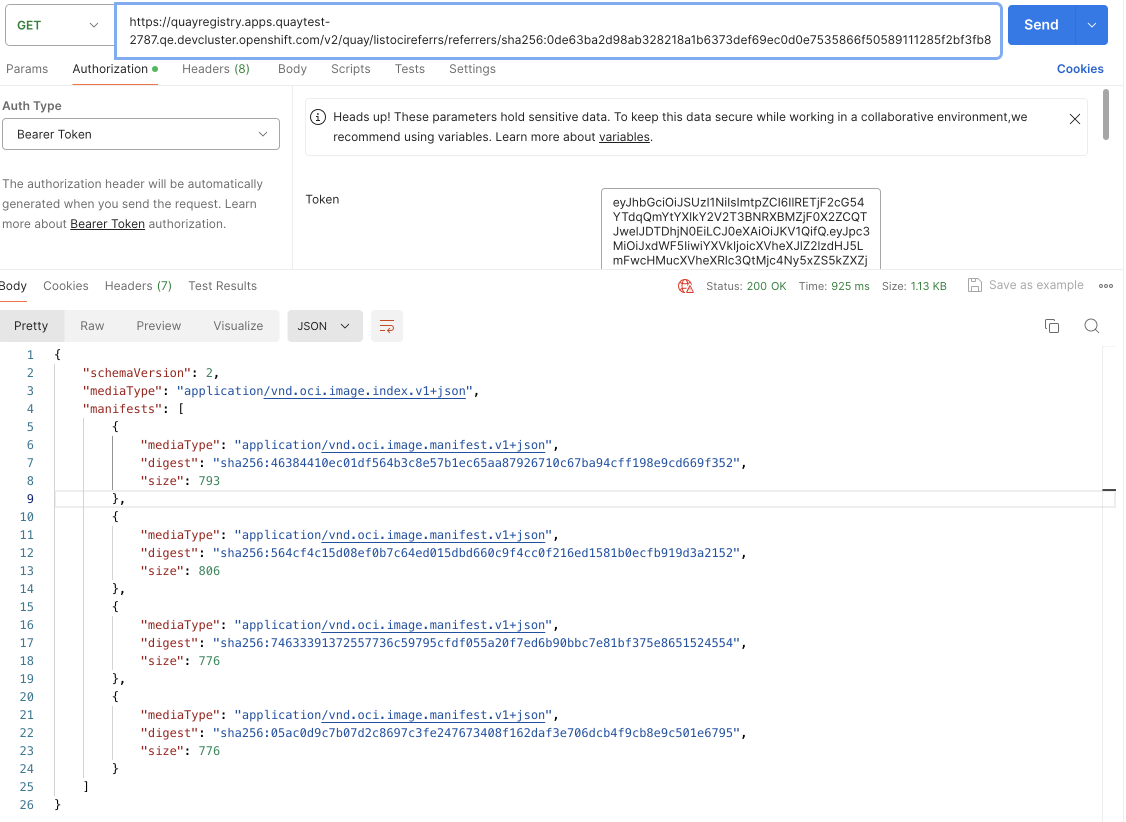 skopeo inspect docker://quay.io/lzha/ocilistreferrs:sha256-0de63ba2d98ab328218a1b6373def69ec0d0e7535866f50589111285f2bf3fb8 --raw | jq { "schemaVersion": 2, "mediaType": "application/vnd.oci.image.index.v1+json", "manifests": [ { "mediaType": "application/vnd.oci.image.manifest.v1+json", "digest": "sha256:342bba778f804eb916006c952ebb51d281d0d4f982bd9fc1d4a120eef4075166", "size": 793, "annotations": { "org.opencontainers.image.created": "2024-07-15T04:57:32Z", "producer": "syft 0.63.0" }, "artifactType": "application/spdx+json" }, { "mediaType": "application/vnd.oci.image.manifest.v1+json", "digest": "sha256:814a632fddc16a7ad93a714691cf8429375c9a15bab0d2f14be449cc8f7bd9eb", "size": 776, "annotations": { "org.opencontainers.image.created": "2024-07-15T04:58:14Z", "producer": "syft 0.63.0" }, "artifactType": "text/spdx" }, { "mediaType": "application/vnd.oci.image.manifest.v1+json", "digest": "sha256:f195f9f73b0e30aab9014237d3a5f25a42673b072956d03215c984dfb4ee2a6f", "size": 806, "annotations": { "org.opencontainers.image.created": "2024-07-15T04:58:43Z", "producer": "syft 0.63.0" }, "artifactType": "application/vnd.cyclonedx+json" } ] } curl --location 'https://quay.io/v2/lzha/ocilistreferrs/referrers/sha256:0de63ba2d98ab328218a1b6373def69ec0d0e7535866f50589111285f2bf3fb8' \ --header 'Authorization: Bearer ******' | jq { "schemaVersion": 2, "mediaType": "application/vnd.oci.image.index.v1+json", "manifests": [ { "mediaType": "application/vnd.oci.image.manifest.v1+json", "digest": "sha256:342bba778f804eb916006c952ebb51d281d0d4f982bd9fc1d4a120eef4075166", "size": 793 }, { "mediaType": "application/vnd.oci.image.manifest.v1+json", "digest": "sha256:814a632fddc16a7ad93a714691cf8429375c9a15bab0d2f14be449cc8f7bd9eb", "size": 776 }, { "mediaType": "application/vnd.oci.image.manifest.v1+json", "digest": "sha256:f195f9f73b0e30aab9014237d3a5f25a42673b072956d03215c984dfb4ee2a6f", "size": 806 } ] }
