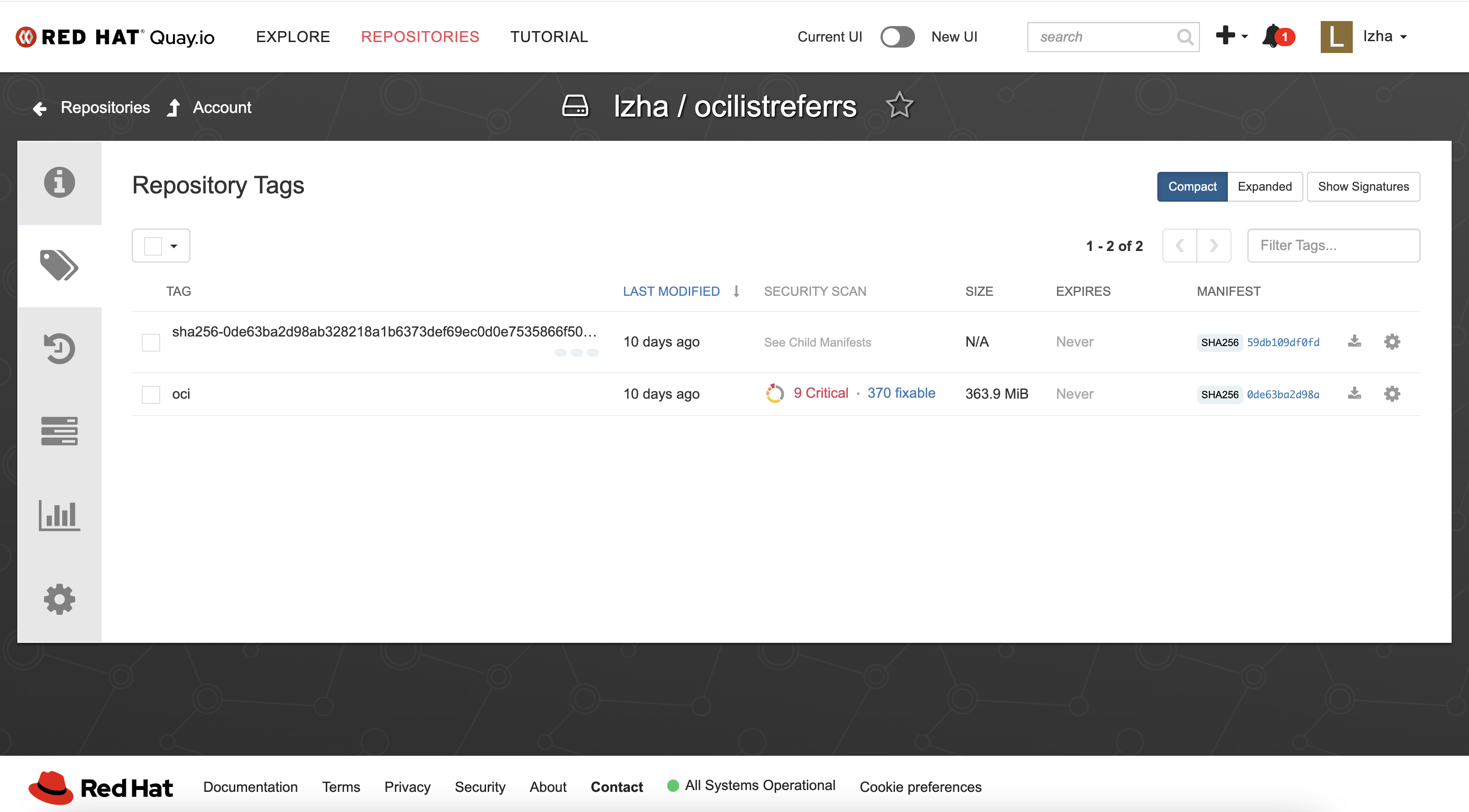 oras version Version: 1.2.0+Homebrew Go version: go1.22.3 oras discover --format tree quay.io/lzha/ocilistreferrs:oci quay.io/lzha/ocilistreferrs@sha256:0de63ba2d98ab328218a1b6373def69ec0d0e7535866f50589111285f2bf3fb8 └── <unknown> ├── sha256:342bba778f804eb916006c952ebb51d281d0d4f982bd9fc1d4a120eef4075166 ├── sha256:814a632fddc16a7ad93a714691cf8429375c9a15bab0d2f14be449cc8f7bd9eb └── sha256:f195f9f73b0e30aab9014237d3a5f25a42673b072956d03215c984dfb4ee2a6f skopeo inspect docker://quay.io/lzha/ocilistreferrs@sha256:59db109df0fd8106eb47079c4c8219500e9217401d9b7732d743998ab1b92e36 --raw | jq { "schemaVersion": 2, "mediaType": "application/vnd.oci.image.index.v1+json", "manifests": [ { "mediaType": "application/vnd.oci.image.manifest.v1+json", "digest": "sha256:342bba778f804eb916006c952ebb51d281d0d4f982bd9fc1d4a120eef4075166", "size": 793, "annotations": { "org.opencontainers.image.created": "2024-07-15T04:57:32Z", "producer": "syft 0.63.0" }, "artifactType": "application/spdx+json" }, { "mediaType": "application/vnd.oci.image.manifest.v1+json", "digest": "sha256:814a632fddc16a7ad93a714691cf8429375c9a15bab0d2f14be449cc8f7bd9eb", "size": 776, "annotations": { "org.opencontainers.image.created": "2024-07-15T04:58:14Z", "producer": "syft 0.63.0" }, "artifactType": "text/spdx" }, { "mediaType": "application/vnd.oci.image.manifest.v1+json", "digest": "sha256:f195f9f73b0e30aab9014237d3a5f25a42673b072956d03215c984dfb4ee2a6f", "size": 806, "annotations": { "org.opencontainers.image.created": "2024-07-15T04:58:43Z", "producer": "syft 0.63.0" }, "artifactType": "application/vnd.cyclonedx+json" } ] }
