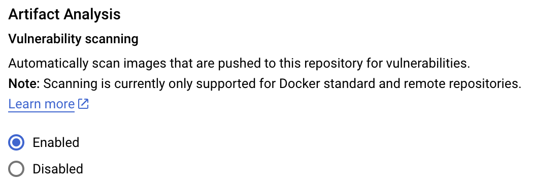 Example: GCP Artifact Registry support enable/disable "Vulnerability Scanning" when create new repository: