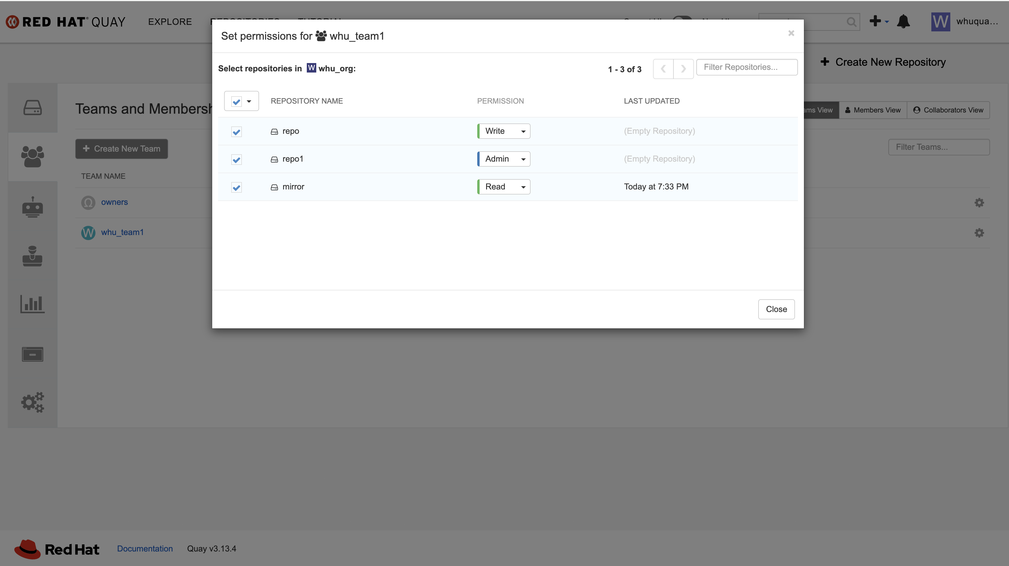 But after clicking the black text of the REPOSITORIES column, can get Set permissions popup.