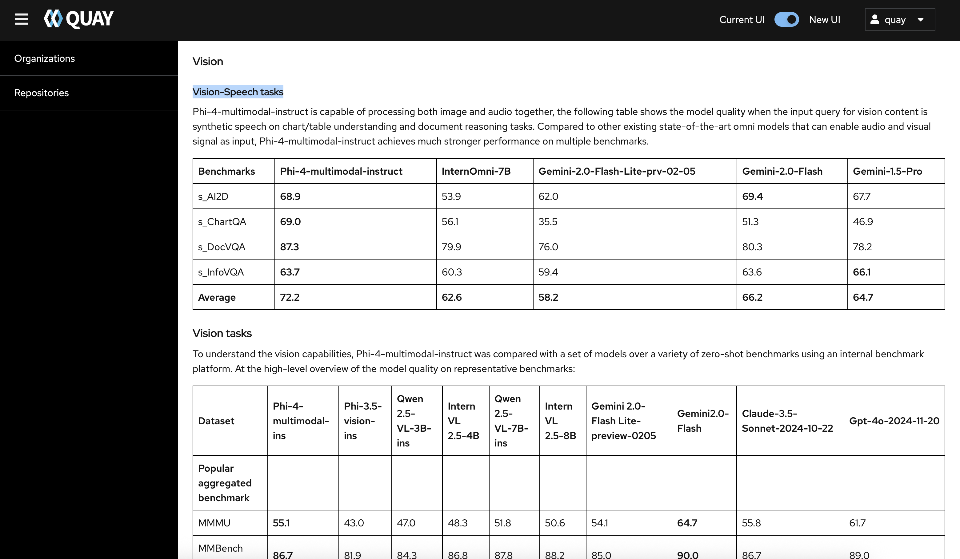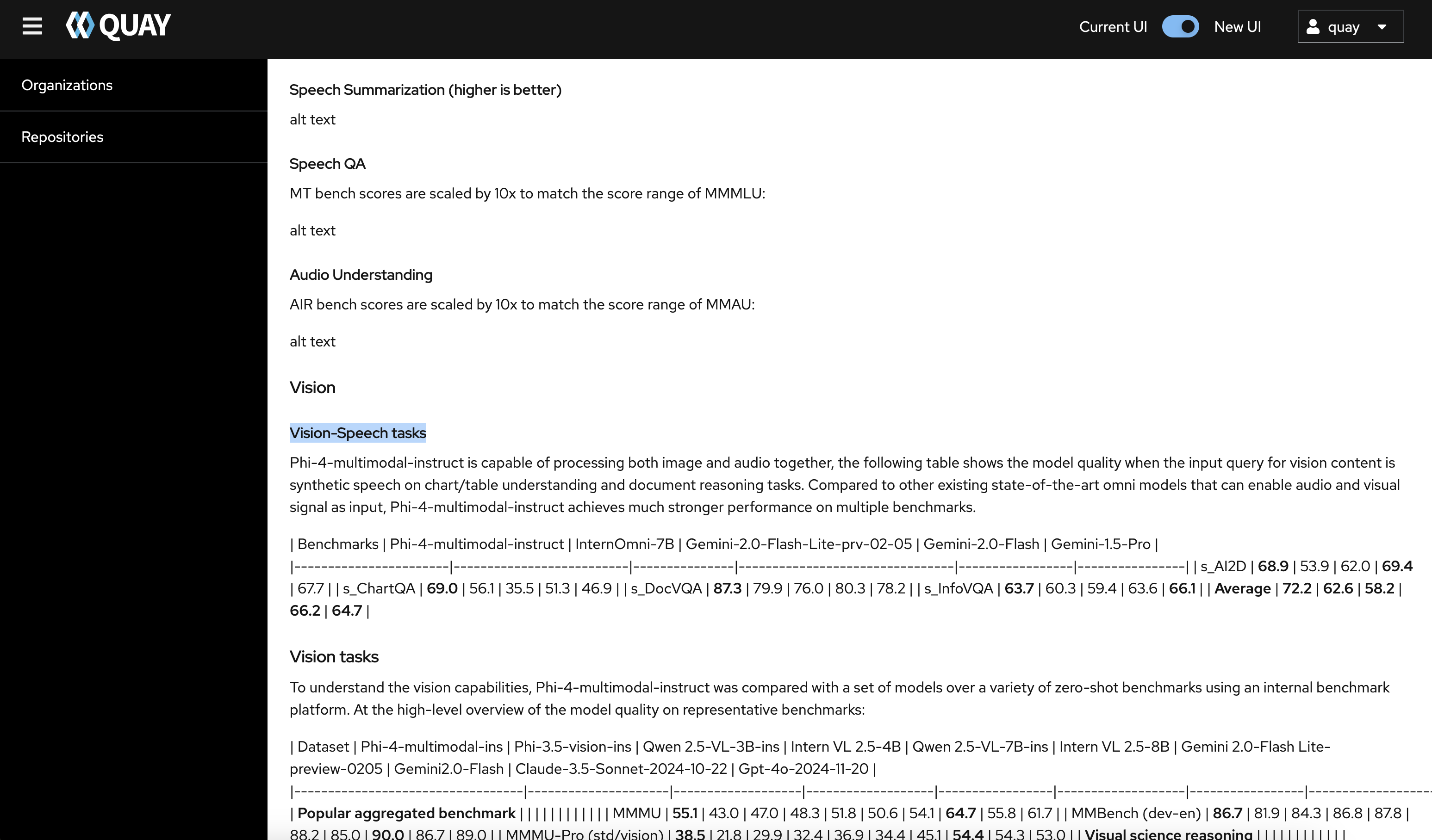 This is an issue found in Quay 3.14.0 new UI Model Card Support, after pushed AI Model to Quay, navigate to Quay new UI and click the image tag, found Quay new UI Model Card can't display the table in correct format, compared the behavior of HuggingFace with the same Model Card "README.md" file, HuggingFace can display the table in correct format, pls review this issue.