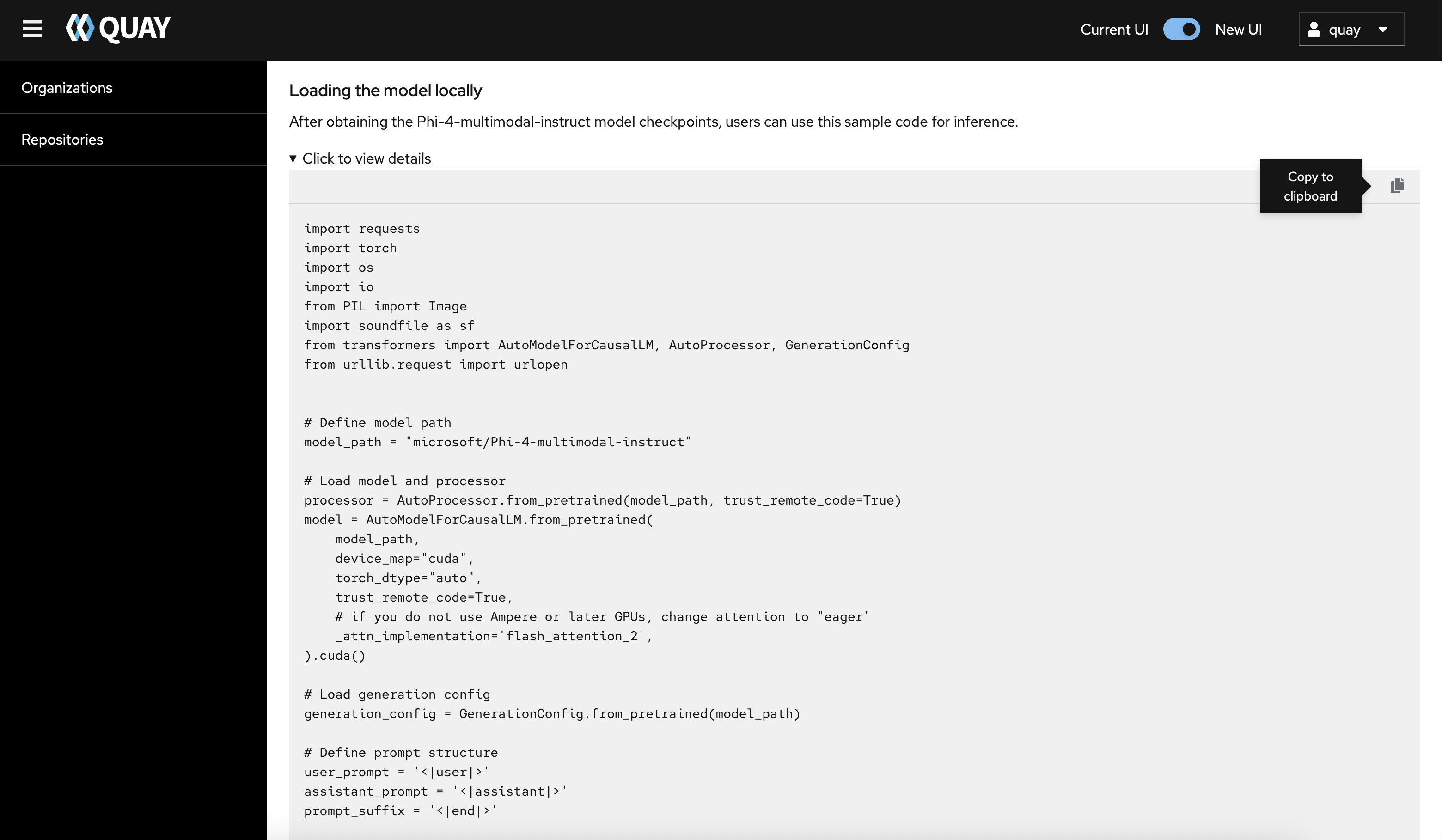 This is an issue found in Quay 3.14.0 new UI Model Card, after pushed AI Model to Quay, navigate to the new UI Mode Card, found Quay 3.14.0 new UI Model Card doesn't display the sample codes into code area and doesn't provide the "copy code" button, by comparing the HuggingFace Model Card, that's correct, pls review this Model Card new UI issue.
