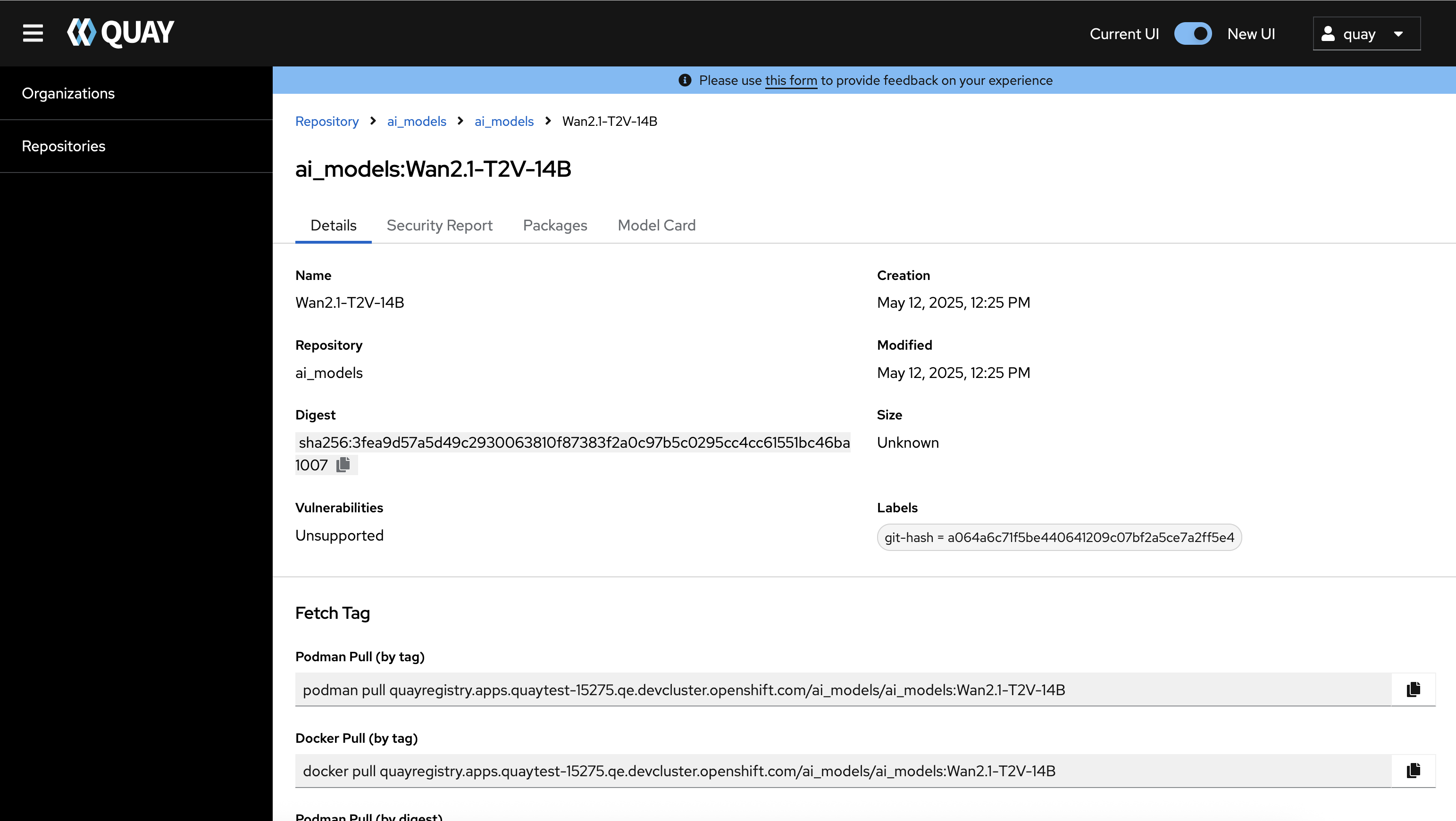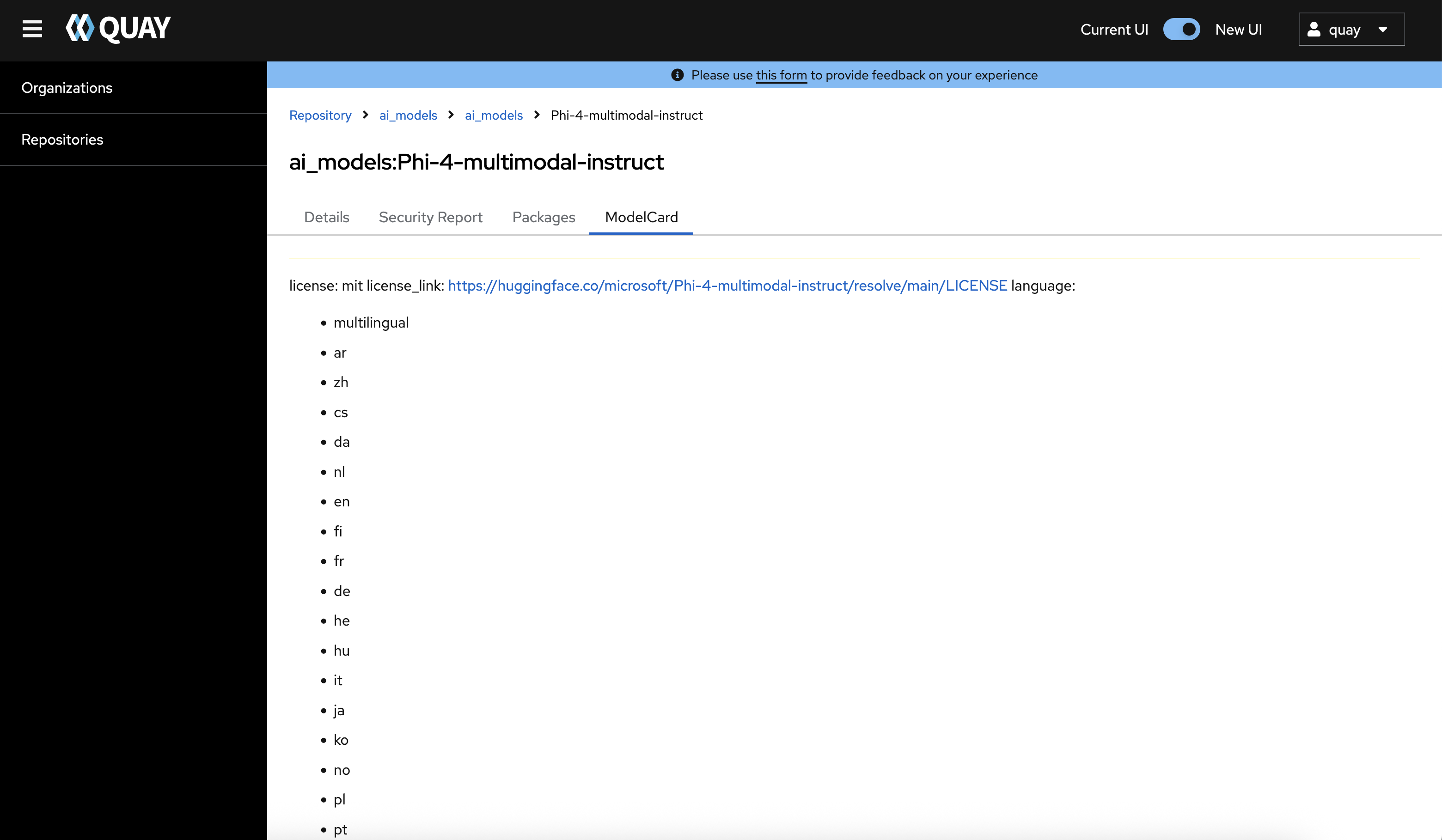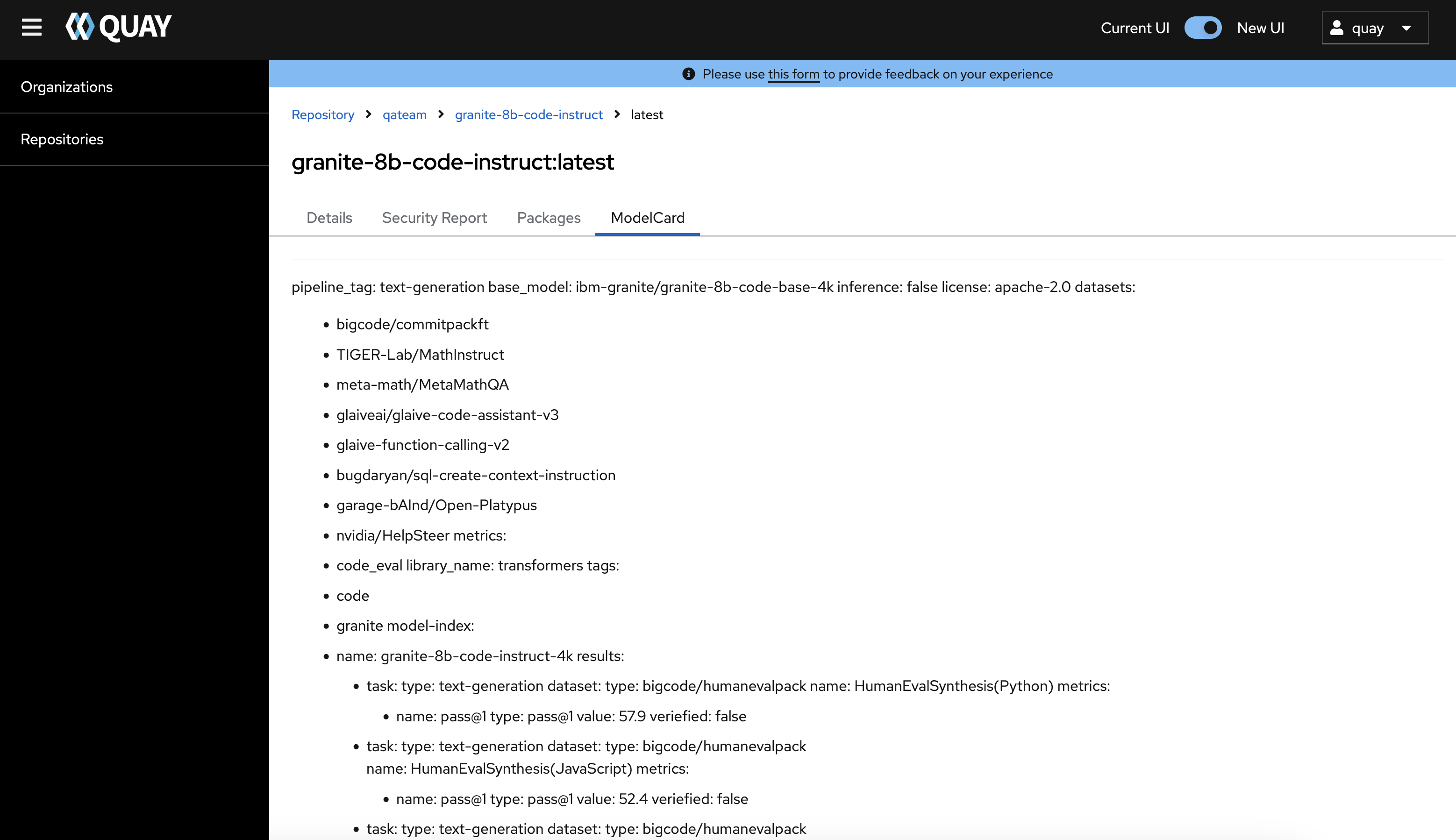 Quay 3.14.0 new UI Model Card Tab: