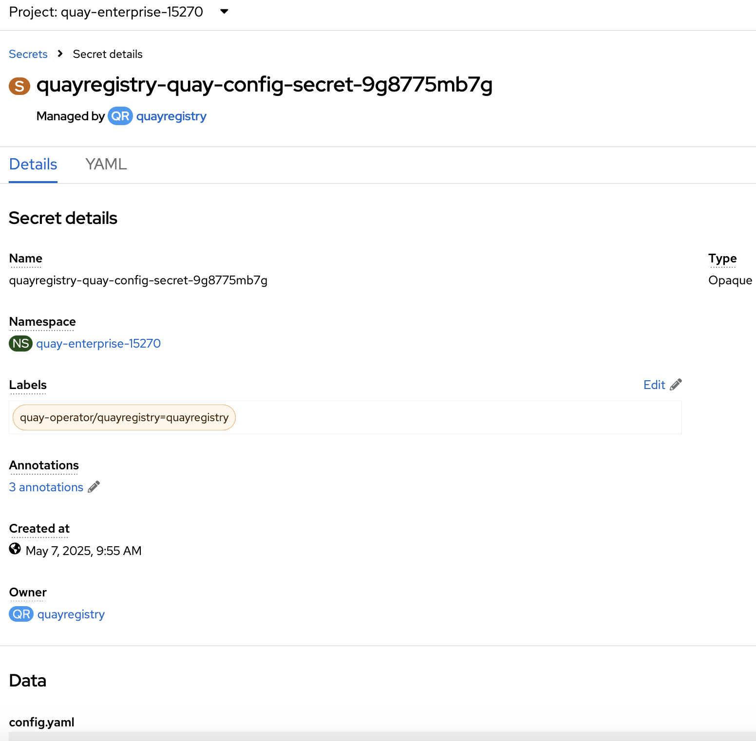 {"level":"info","ts":"2025-05-07T01:55:20Z","logger":"controllers.QuayRegistry","msg":"deleting old objects","quayregistry":"quay-enterprise-15270/quayregistry"} {"level":"info","ts":"2025-05-07T01:55:20Z","logger":"controllers.QuayRegistry","msg":"creating/updating object","quayregistry":"quay-enterprise-15270/quayregistry","kind":"Secret","name":"quayregistry-quay-config-secret-9g8775mb7g"}