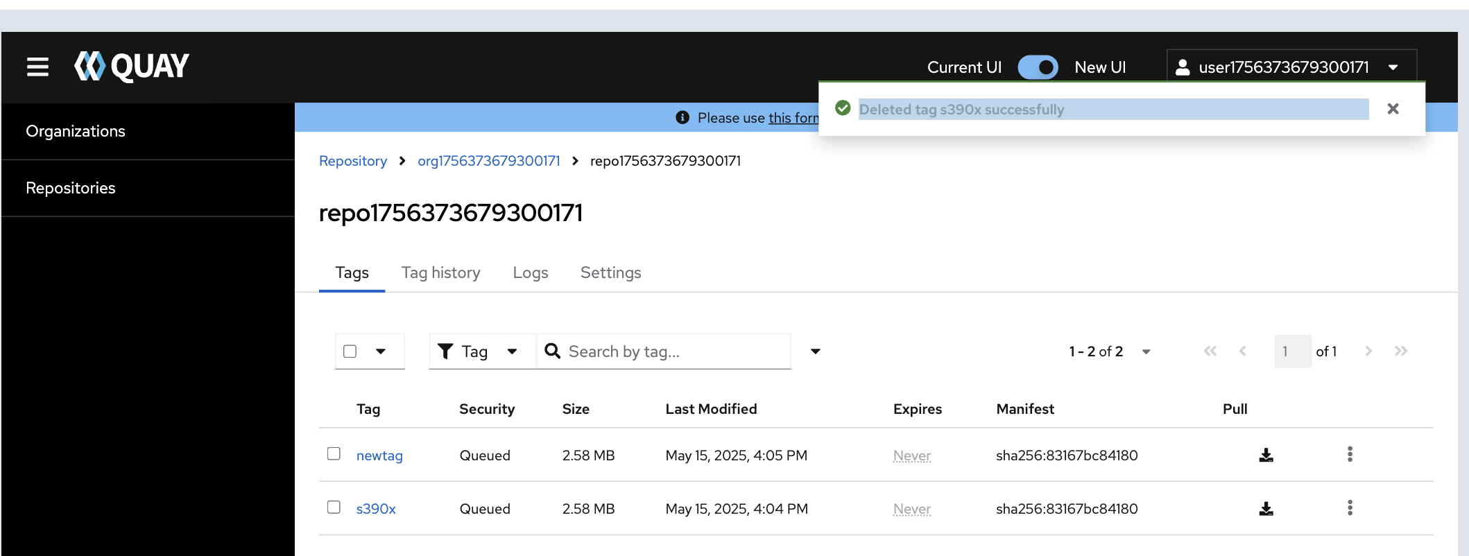 In quay new UI, when add/update/delete a resource,  alert message will pop up to show if the operations finish successfully. For example, when you delete a tag, will get below alert message