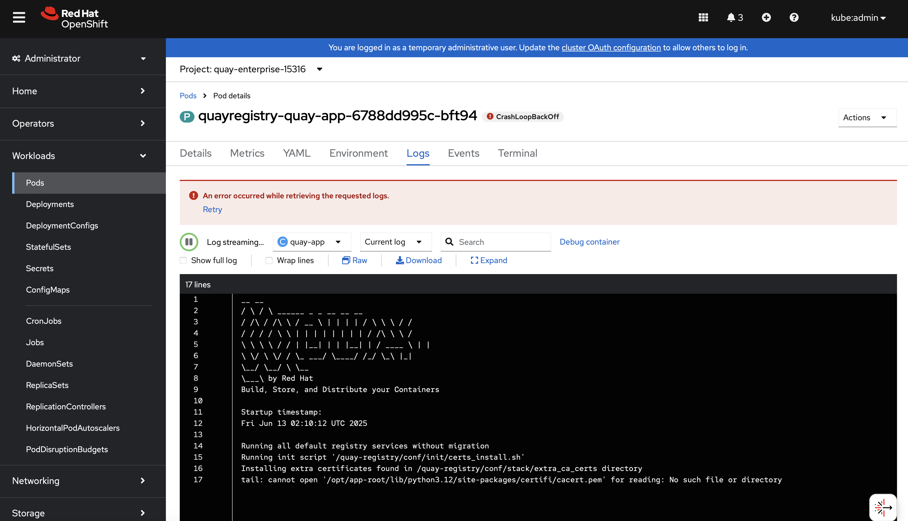 quayregistry-quay-app-6788dd995c-bft94         0/1     CrashLoopBackOff        11 (2m32s ago)   33m