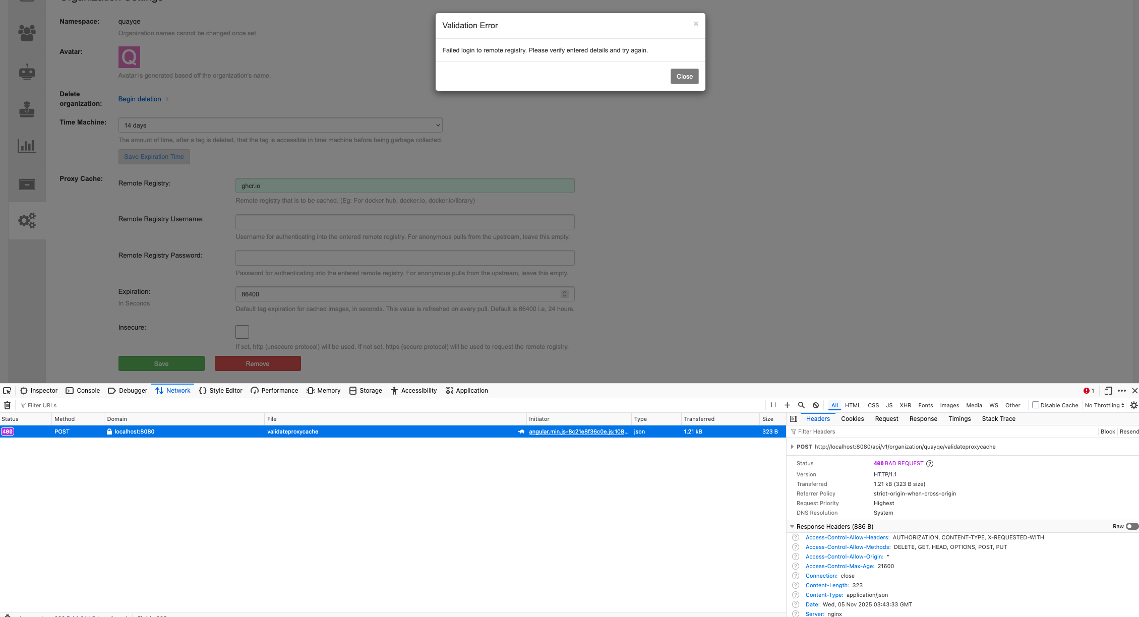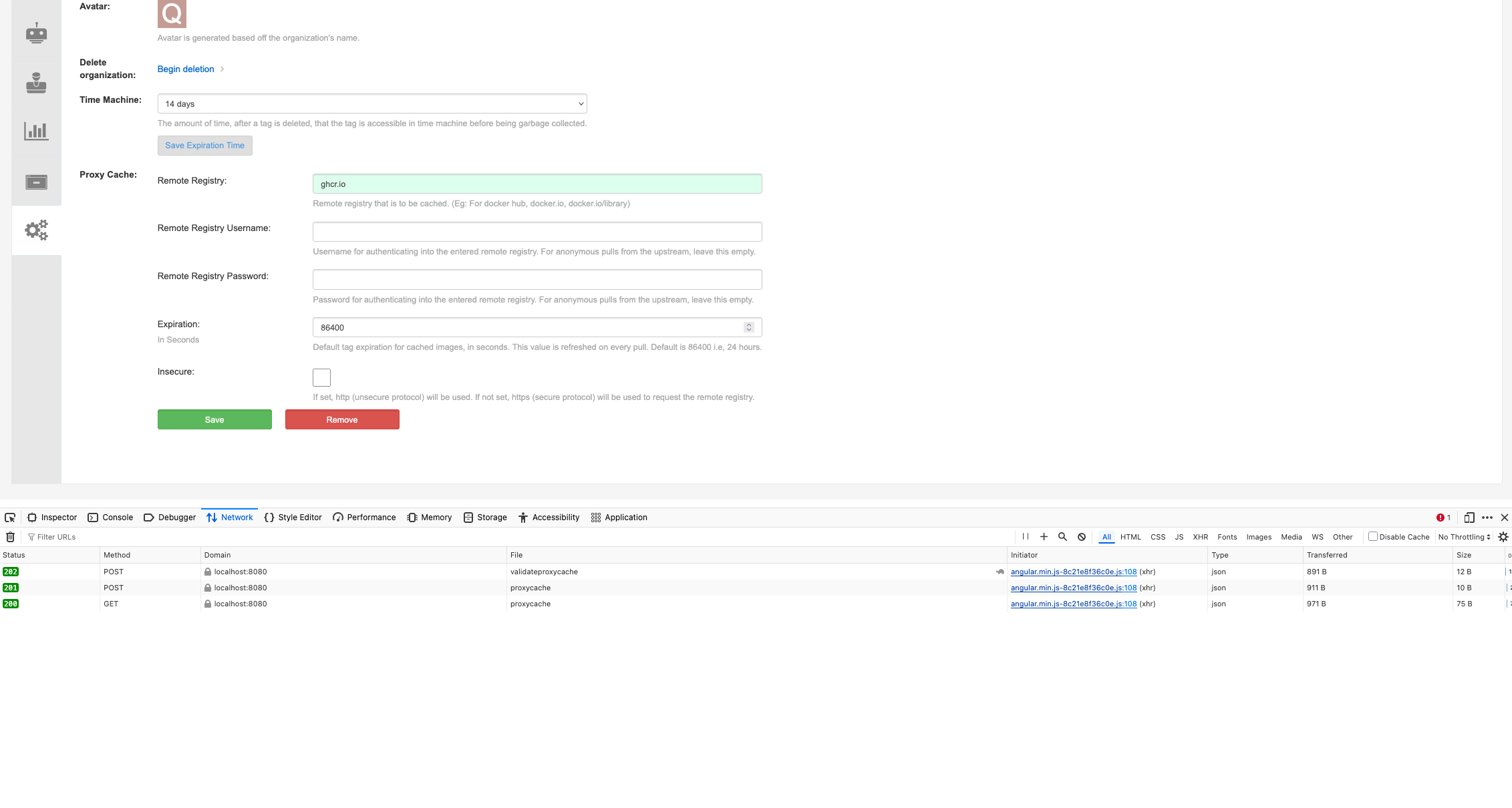When creating an organization and trying to configure the remote registry ghcr.io it's not possible to save the config:
