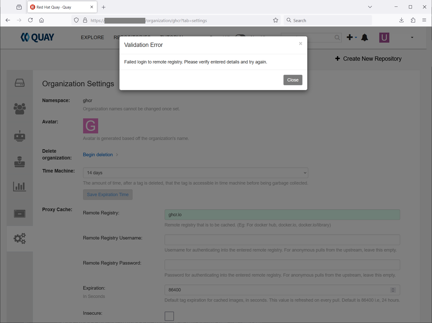 When creating an organization and trying to configure the remote registry ghcr.io it's not possible to save the config: