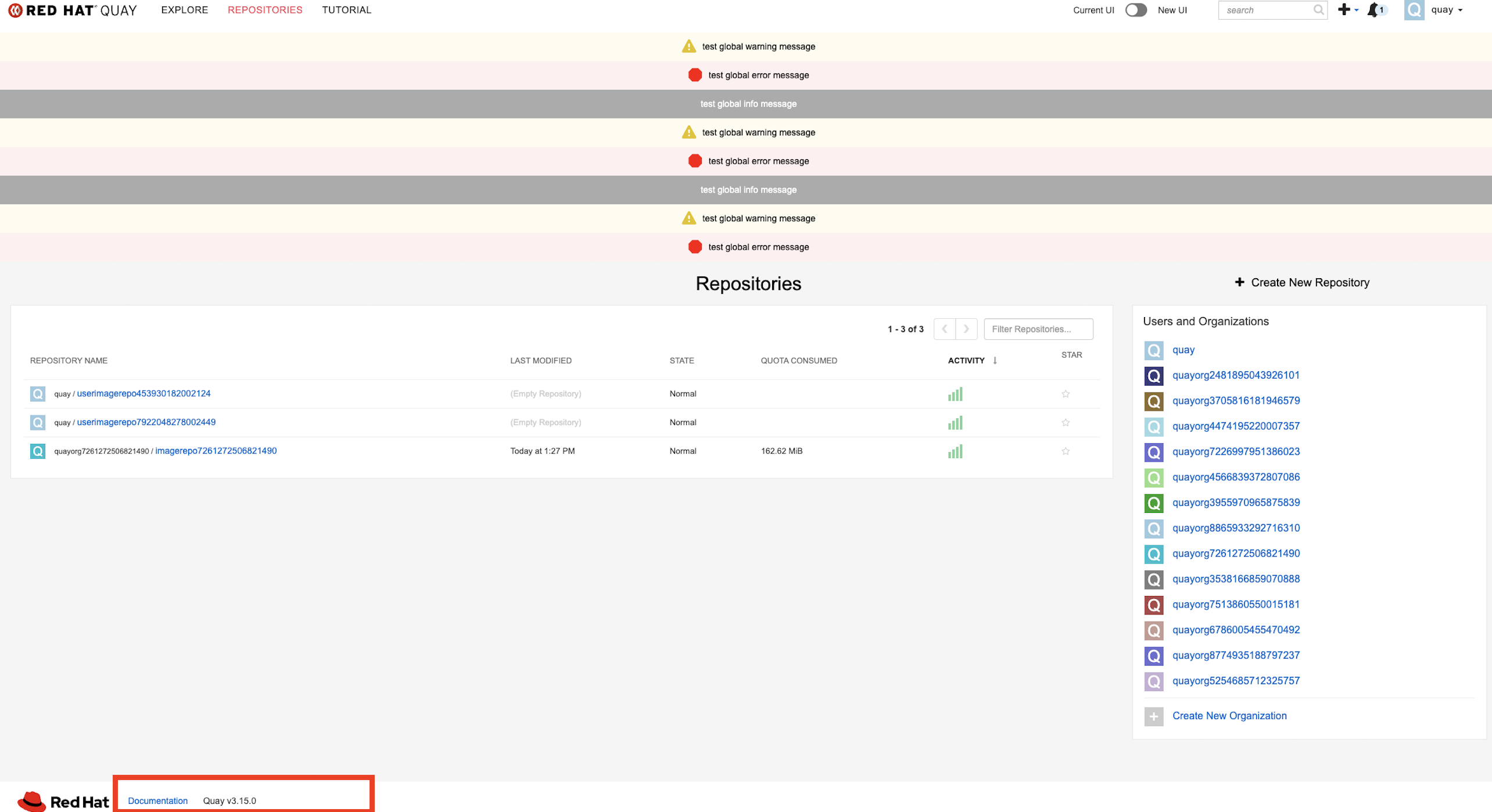 This is an issue found in Quay 3.15.0 new UI, after login Quay new UI Console, find can't see the Quay Version and Quay Documents link, that means in Quay 3.16.0 the once current UI is removed Quay Customers can't find the Quay Version and Quay Documents link on Quay Console, pls review this issue.