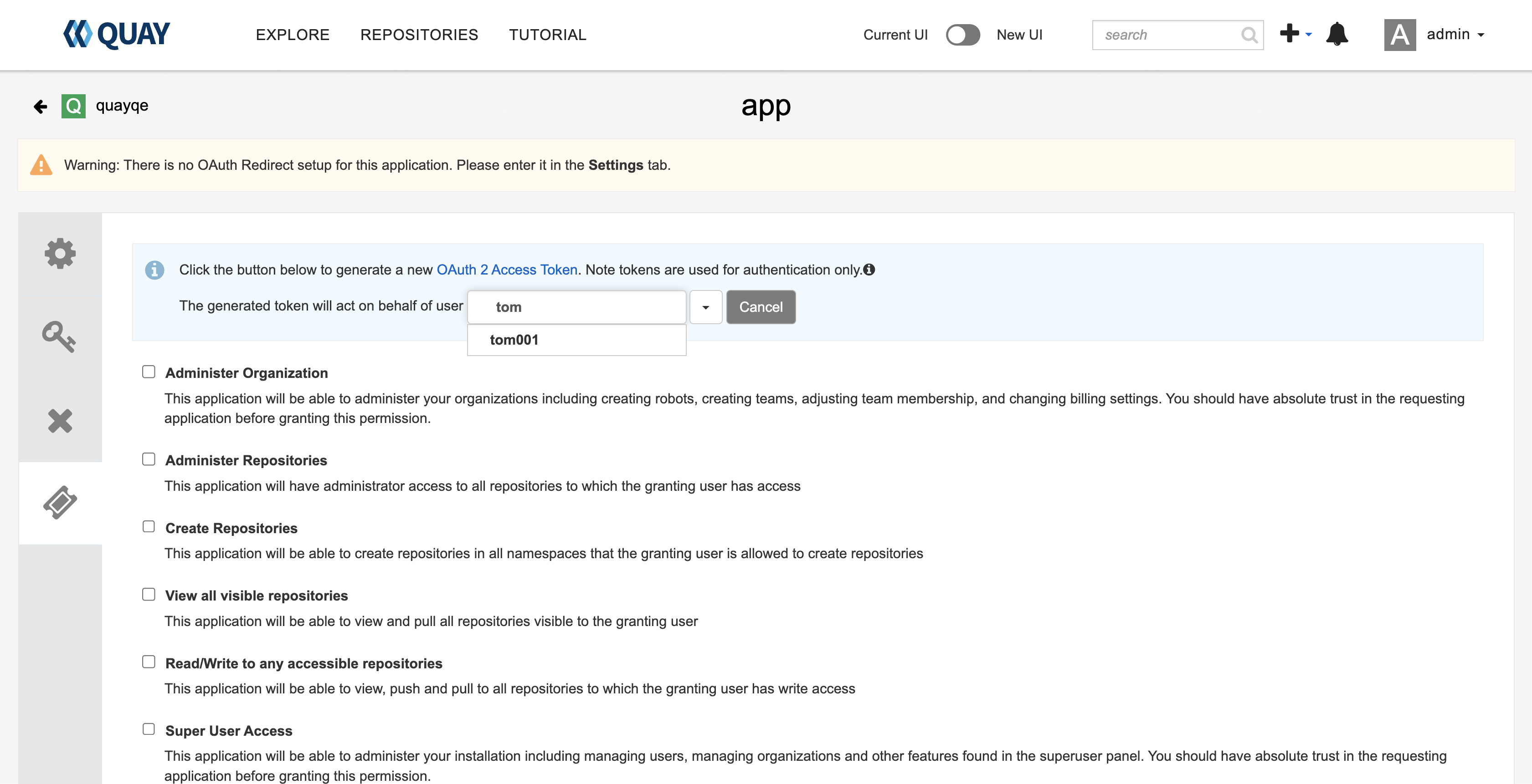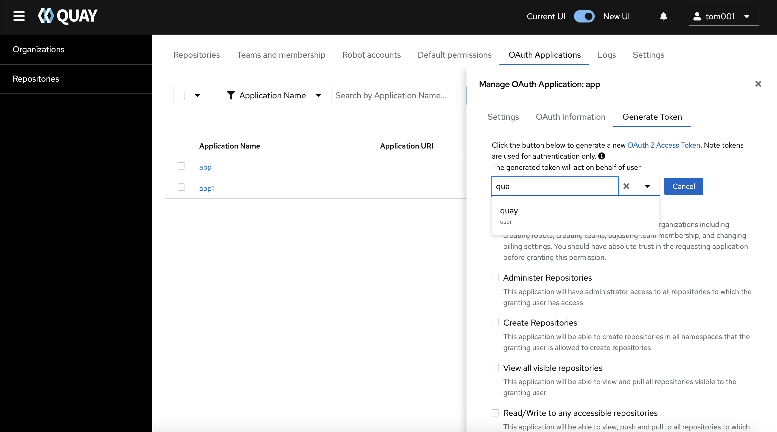 Quay new UI Oauth assign another user: