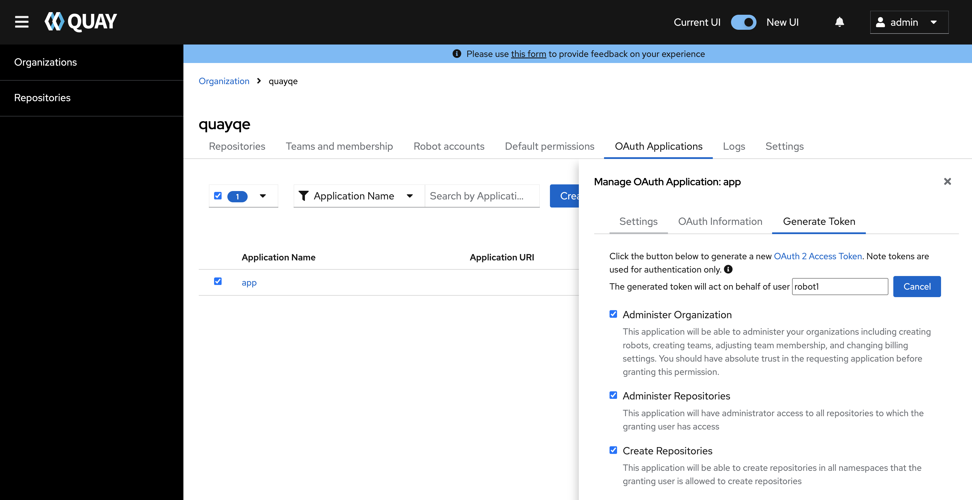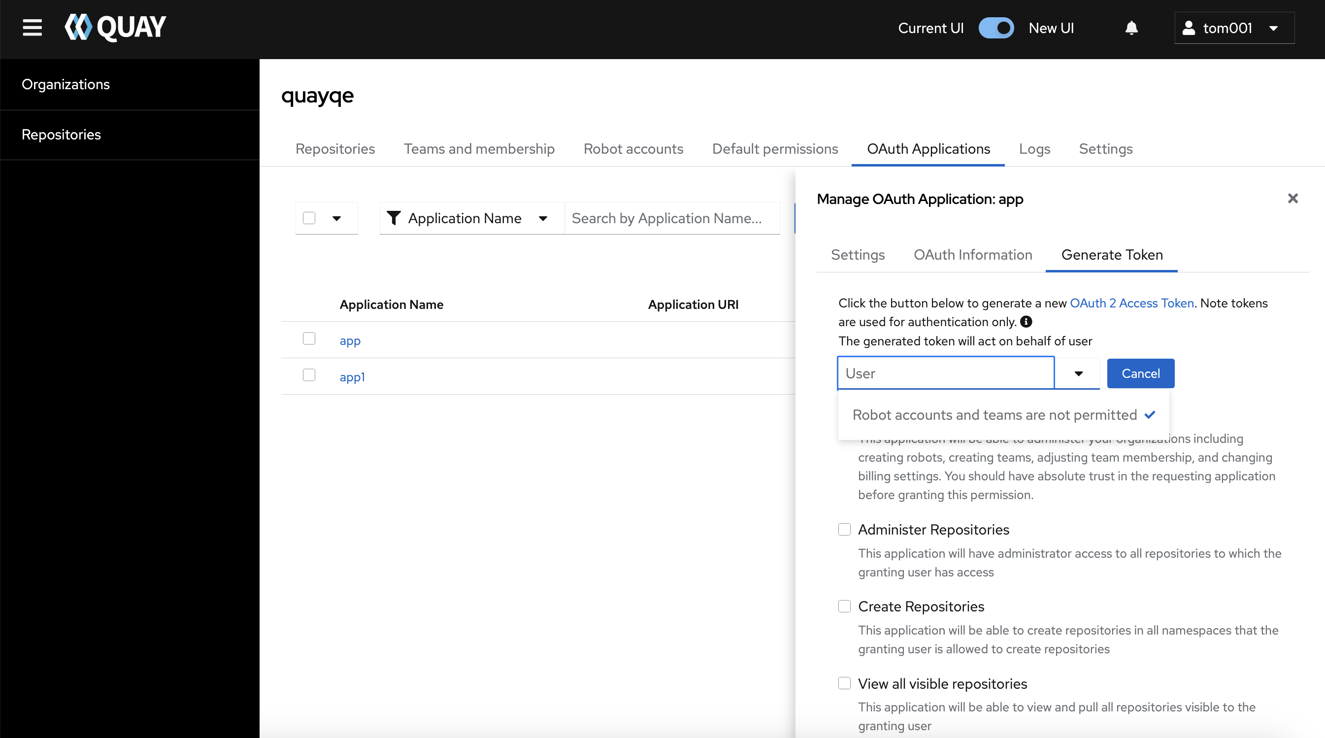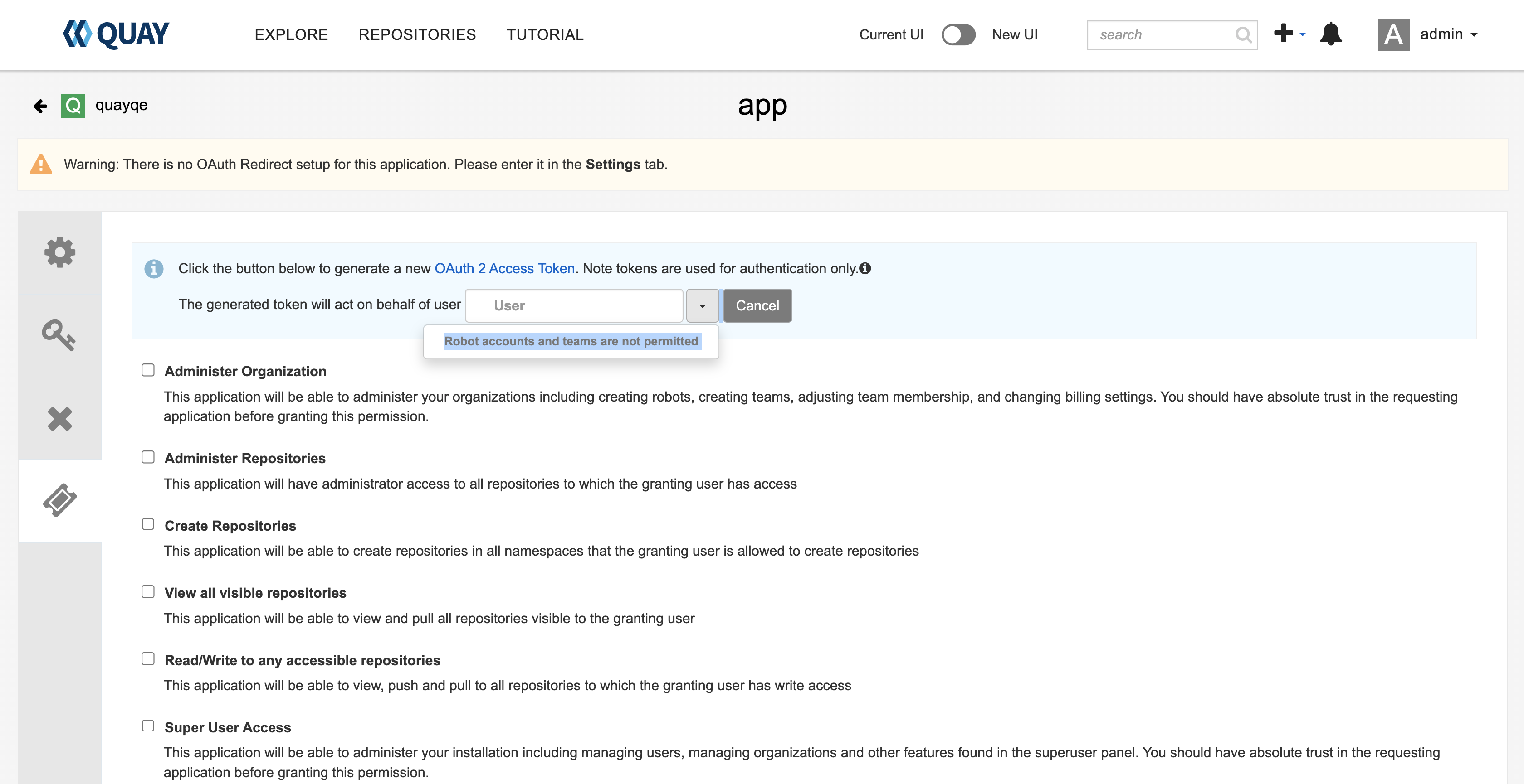 Quay current UI Oauth block assign token to robot account and team: