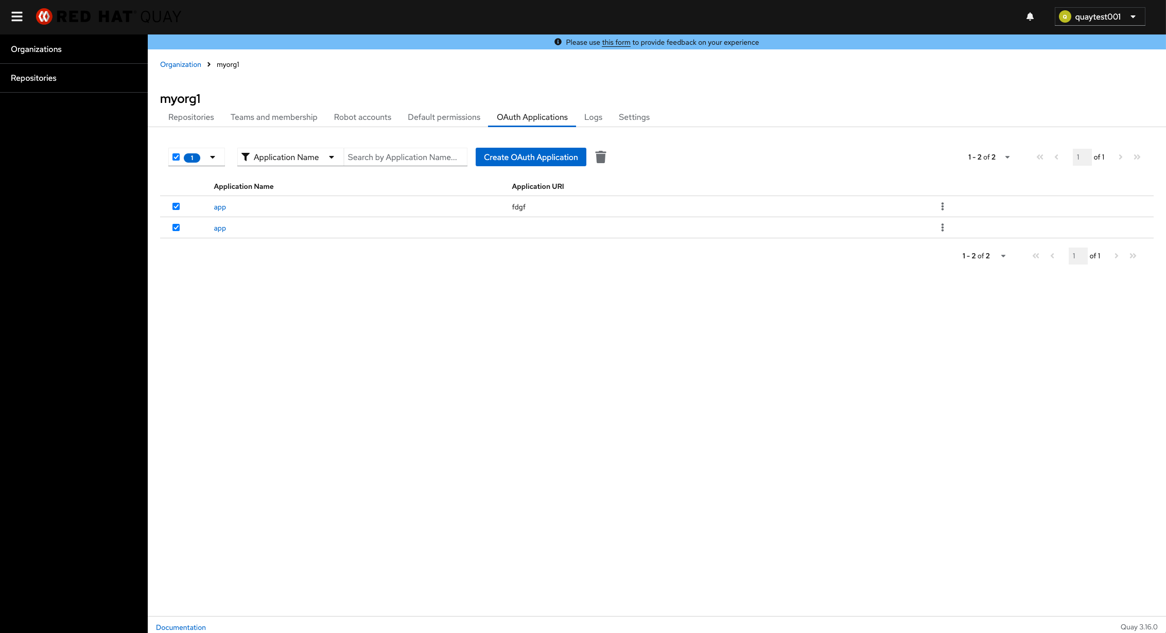 This is an issue found in Quay new UI Oauth, after create some Oauth applications, select all applications, and click the delete button, the results is only one application is deleted successfully, actually all selected Oauth applications should be deleted successfully, pls review this new UI issue.