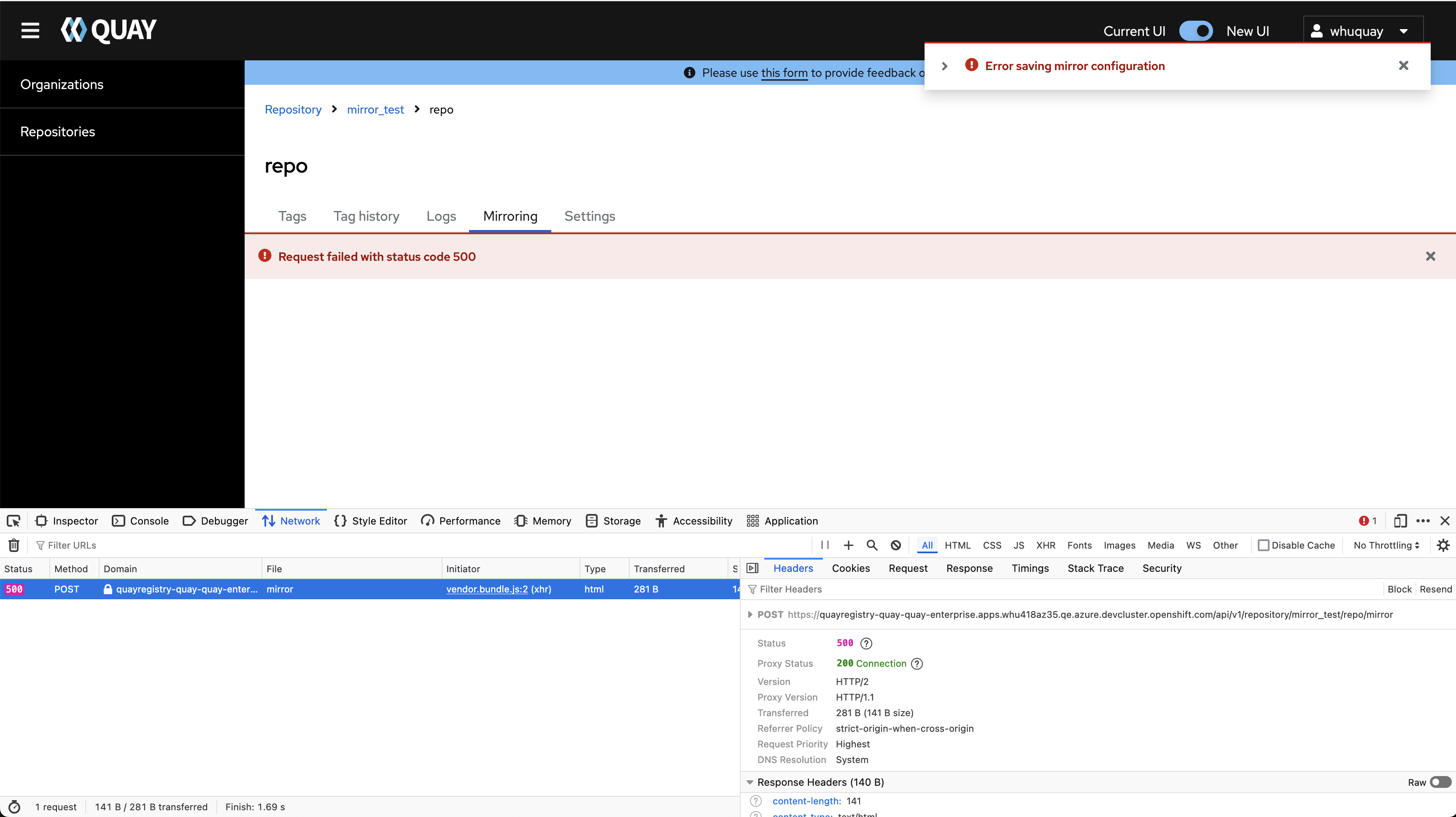 In quay Mirroring tab of new UI, filled in the necessary mirror information, then click "Enable Mirror" button, got 'Request failed with status code 500' error next.
