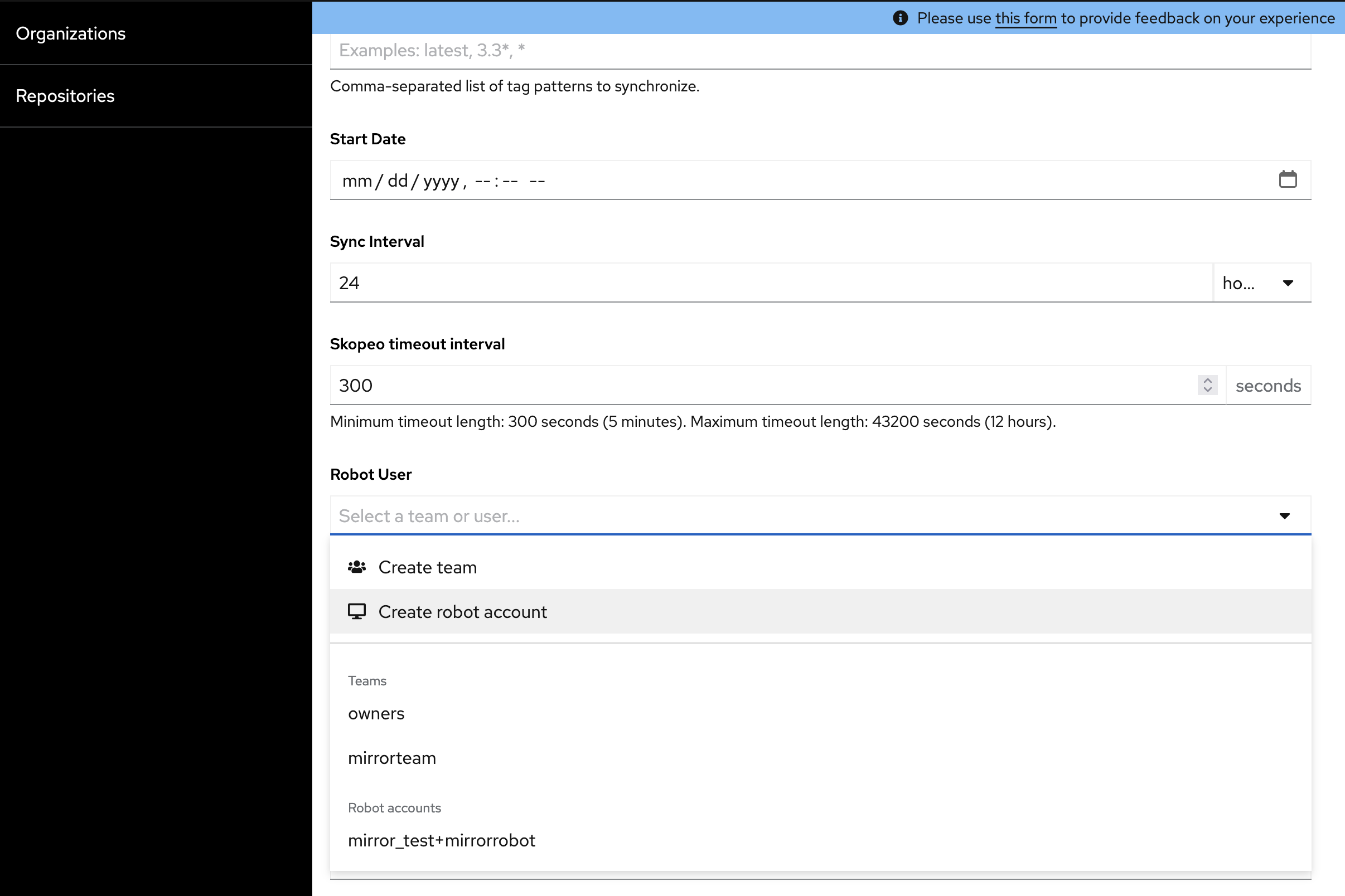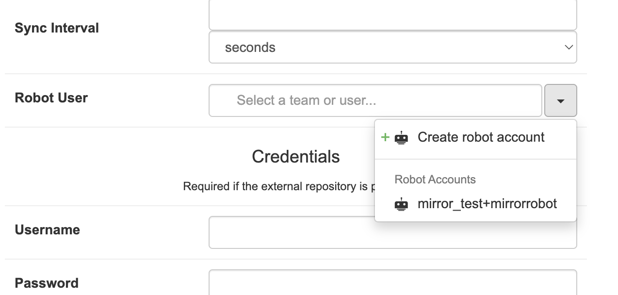 The dropdown list of Robot User field in Mirroring tab are different between old UI and new UI. Can not create team in Robot User field dropdown list in old UI.