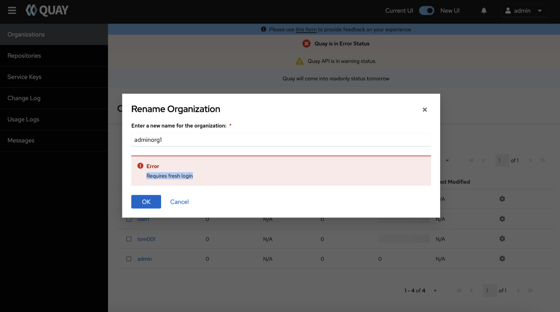 This is an issue found in Quay new UI super user admin page, when Quay super user take some super user operations(e.g. rename organization), if Quay new UI require re-auth, should ask users to input the password immediately, the behavior should be consistent with current UI. Now Quay new UI will ask users to take fresh login, pls review this issue.