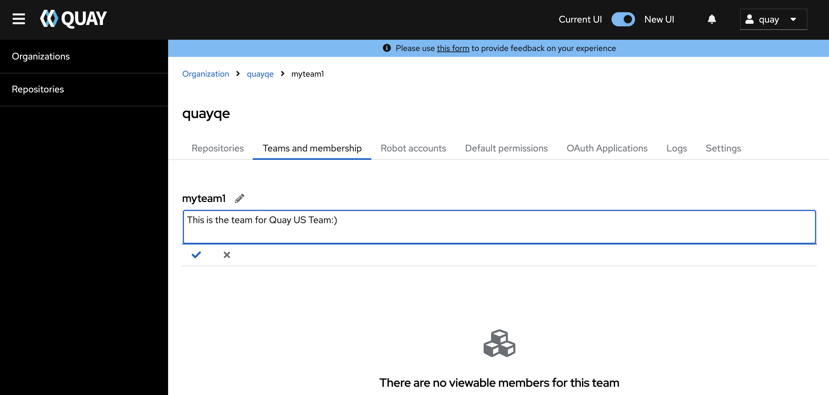 This is an issue found in Quay 3.15.1 new UI, after create new team with specified description in Quay, found on new UI can't click the name of the team to update the description of the target team, pls review this new UI issue.