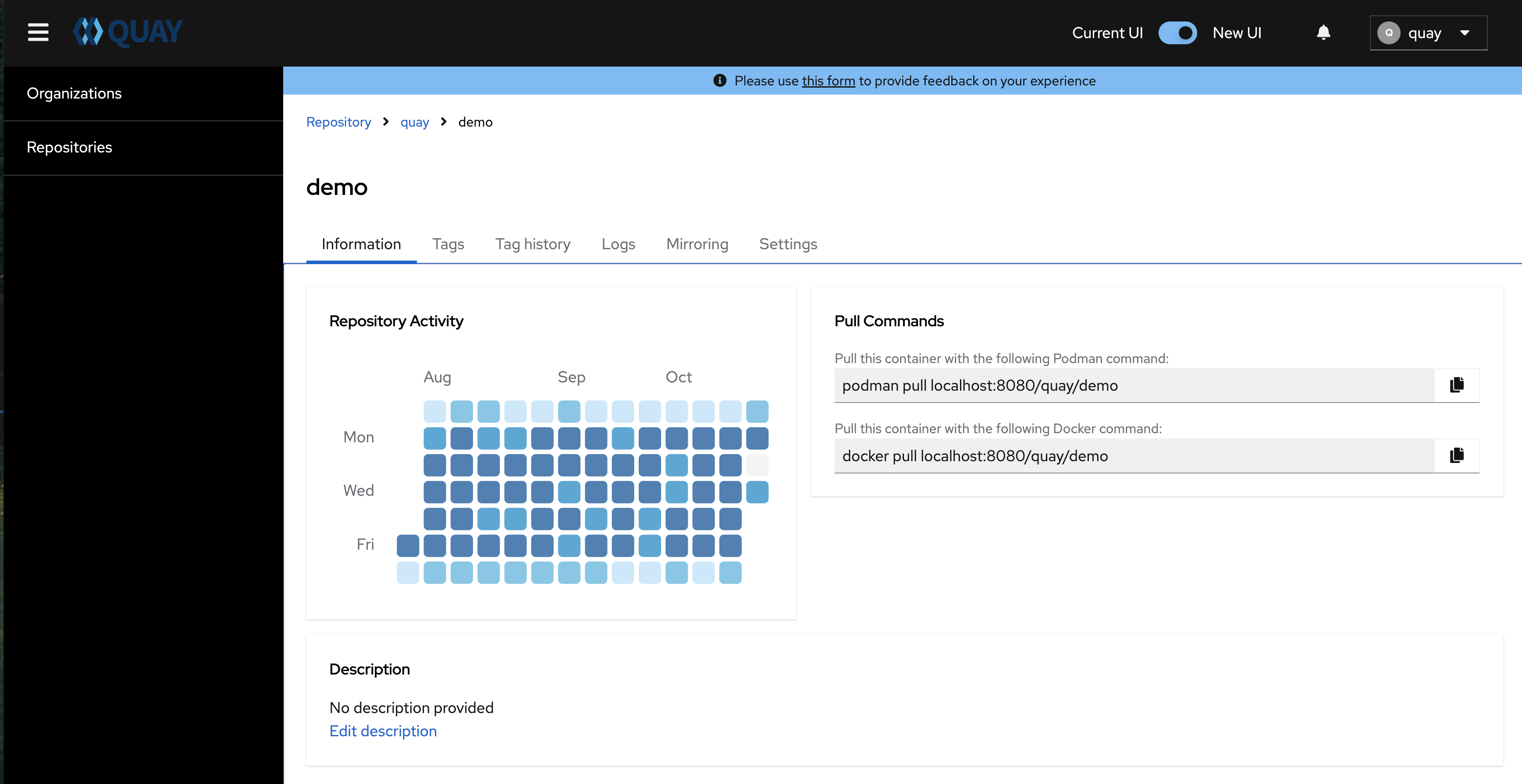 This is an issue found in Quay 3.15.1 new UI, now in Quay Current UI Customers can get Repository Activity via heatmap, but this feature is not existed in Quay new UI, to provide the same user experience Quay new UI should also support "heatmap", pls review this new UI issue.