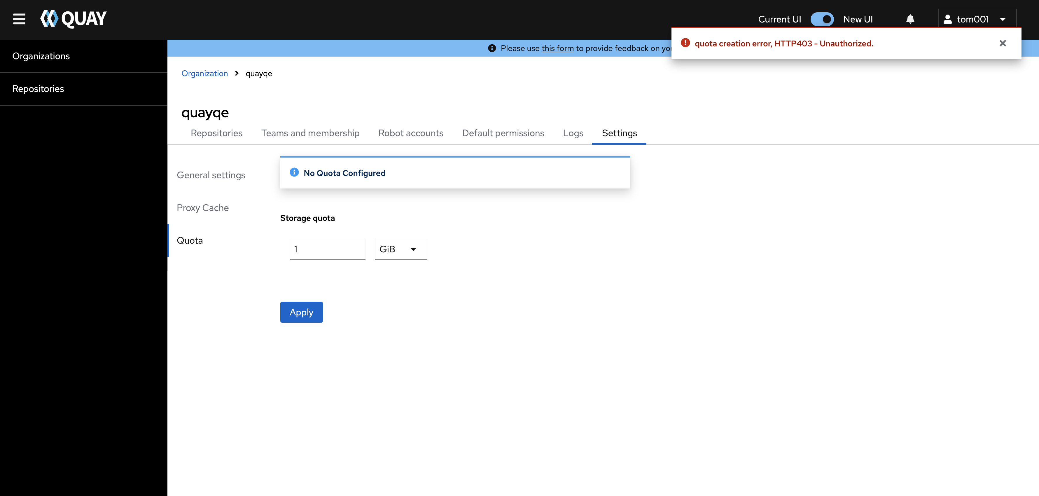 This is an issue found in Quay new UI pre-merge testing, now new UI allow to users to configure the Quota on their organization, but give 403 error message, the behavior is not correct. Comparing with the current UI, only Super users can configure the Quota on Super User admin panel, pls review this issue.