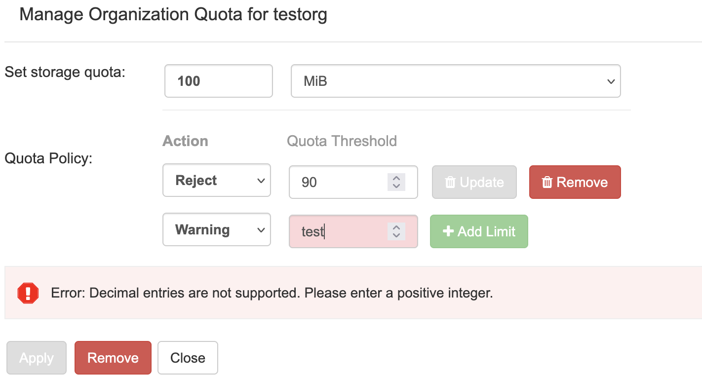 2, Add a Quota policy, input 0 in "Quota Threshold", this is not allow and 0 can't be inputted;