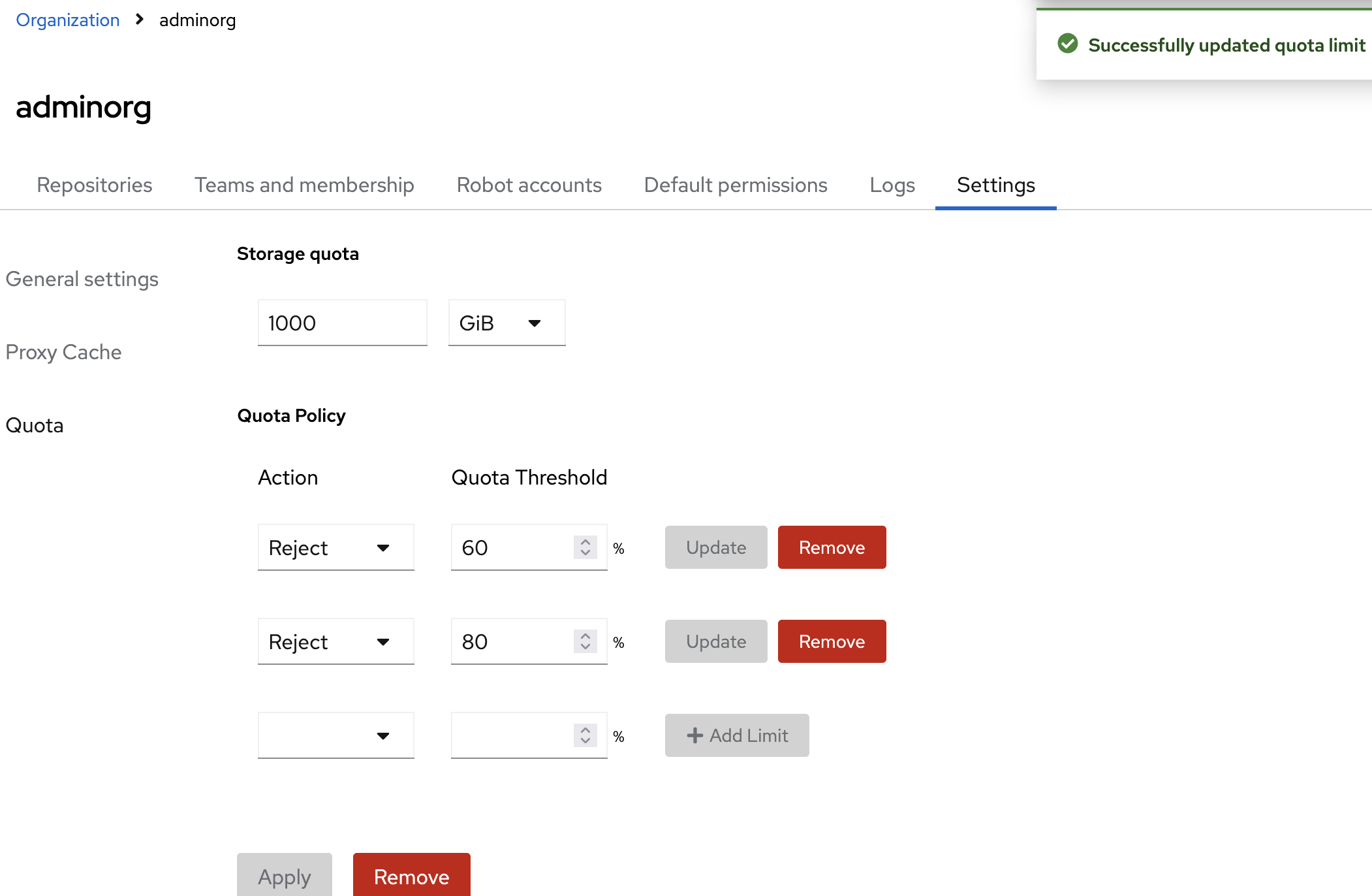 1, Create a Organization, in Setting -> Quota, Add a quota;