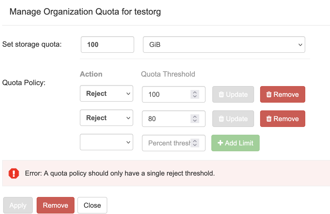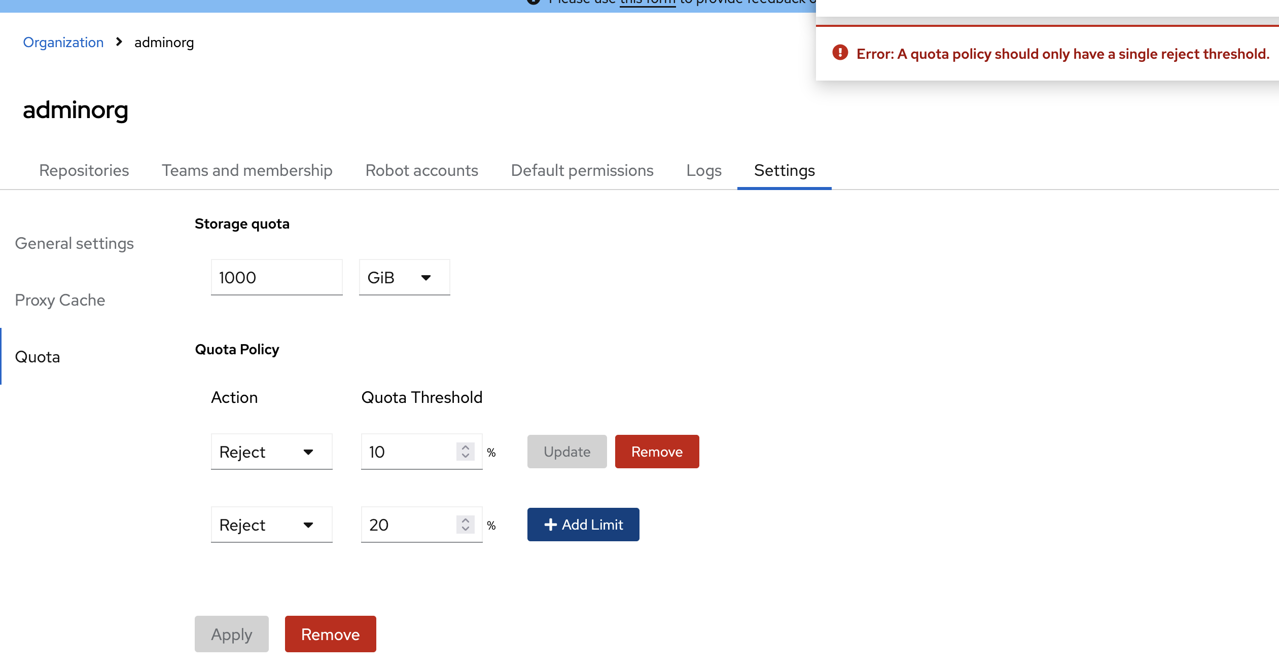 This is Pre Merge Testing for PR https://github.com/quay/quay/pull/4243, Quota management in New UI, "Quota Threshold" Multiple "Reject" policy can be set which should be only one
