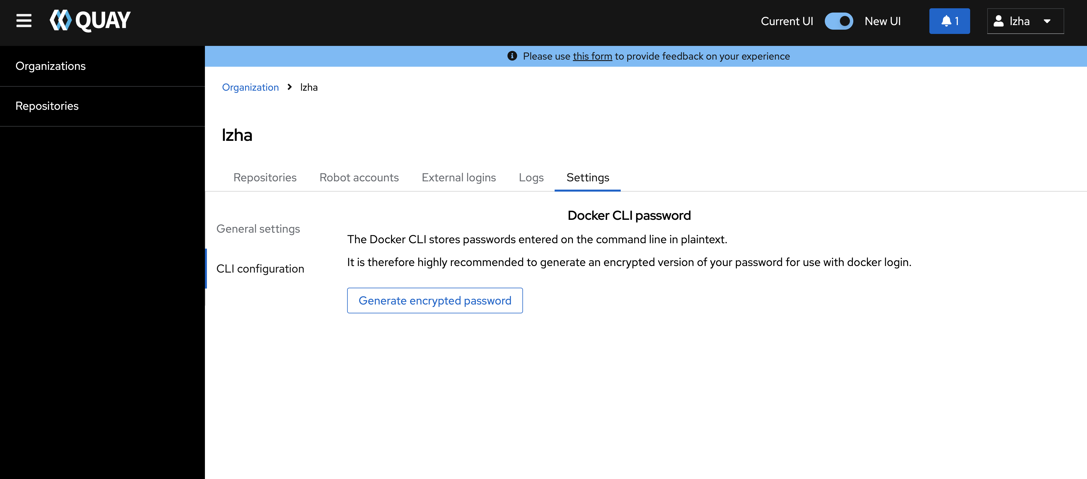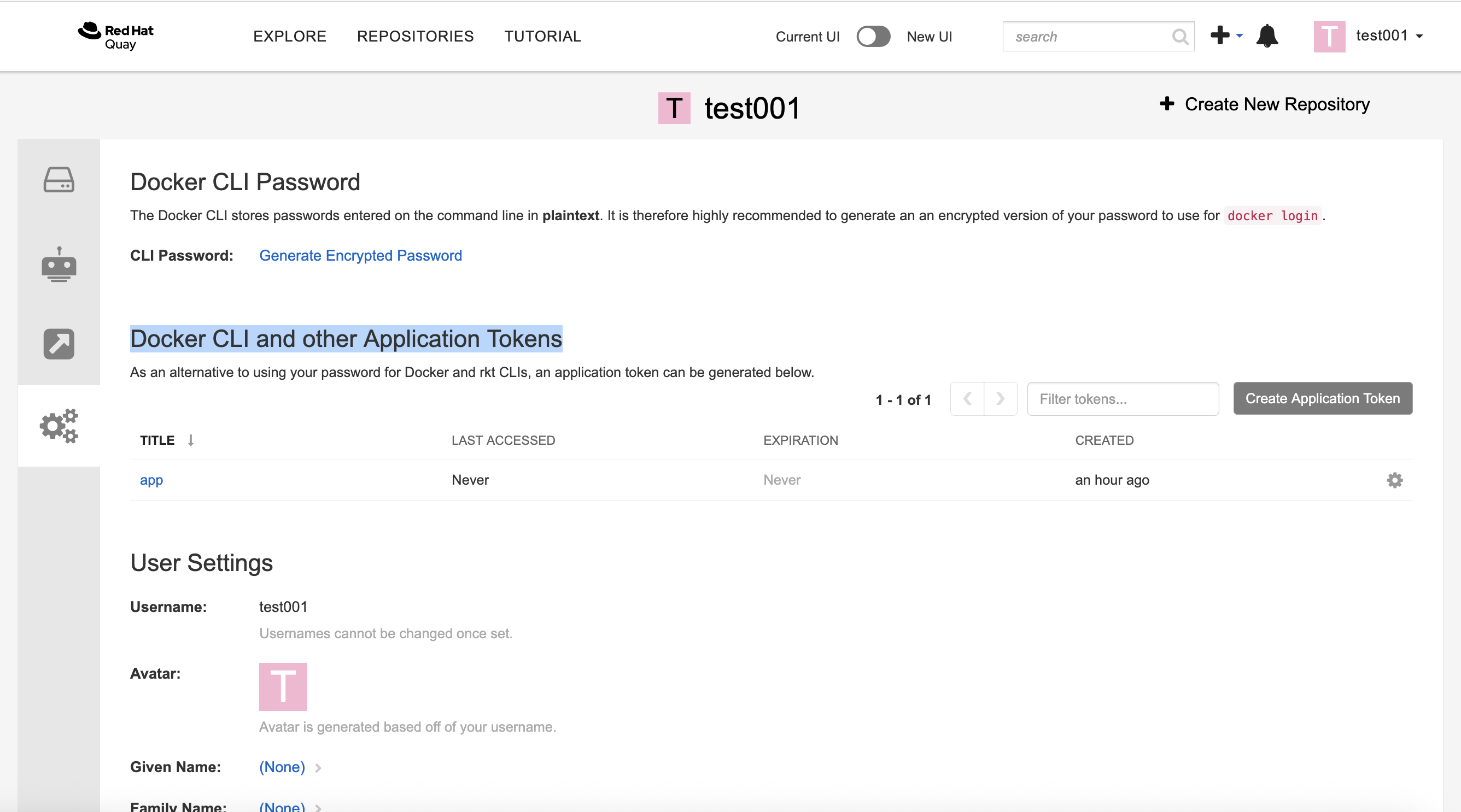 This is an issue found in Quay 3.16.0 new UI pre-merge testing, now on Quay Current UI user can create application tokens, but on new UI can't create application tokens, pls review this new UI issue.