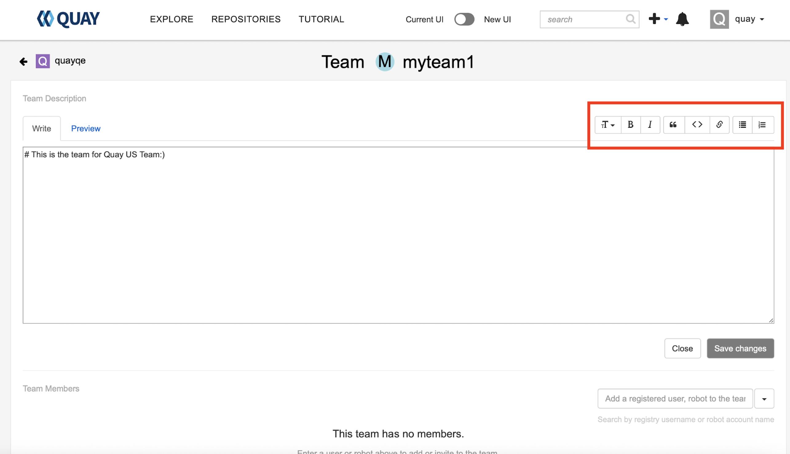 This is an issue found in Quay 3.16.0 new UI, when trying to update the description of Quay Team, found on new UI can't use the format tools and can't take preview, but this functionality is already supported in current UI, pls review this new UI issue.